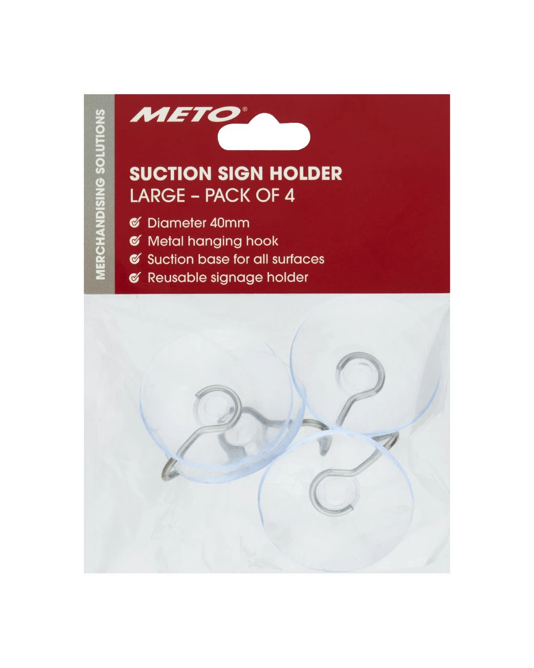 These Meto Suction Sign Holders can be used to hold and secure signage and displays. They utilise a suction system making them easy to adhere and making them ideal for use on windows and glass.