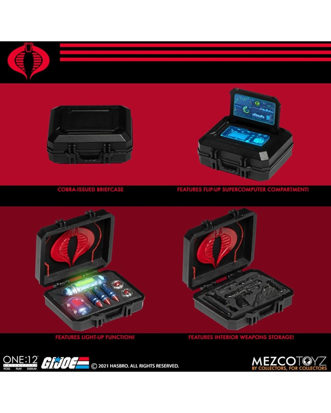 Joining the One:12 Collective, Destro, the weapons supplier to COBRA and leader of M.A.R.S. features his classic tactical outfit with tech enhancements, gauntlets with missile blasters, interchangeable thigh holsters, and combat boots. Destro includes three masked head portraits, sporting his iconic beryllium steel mask and includes his necklace with amulet. The state-of-the-art weapons manufacturer totes only the best of the best, complete with a prototype modular sub-machine gun, pistol with removable magazines, rifle with removable magazines, and missiles that attach to his gauntlet. Destro is always carrying his Cobra-issued, multilayer briefcase with light-up function. The briefcase illuminates via an on/off switch and is complete with a supercomputer and weapon storage. James McCullen Destro is a cutthroat and unyielding businessman with a great sense of honor and is always prepared to cause trouble for the Joes. The infamous arms dealer is known for engineering high-tech weaponry and supplying to whoever can meet his price.