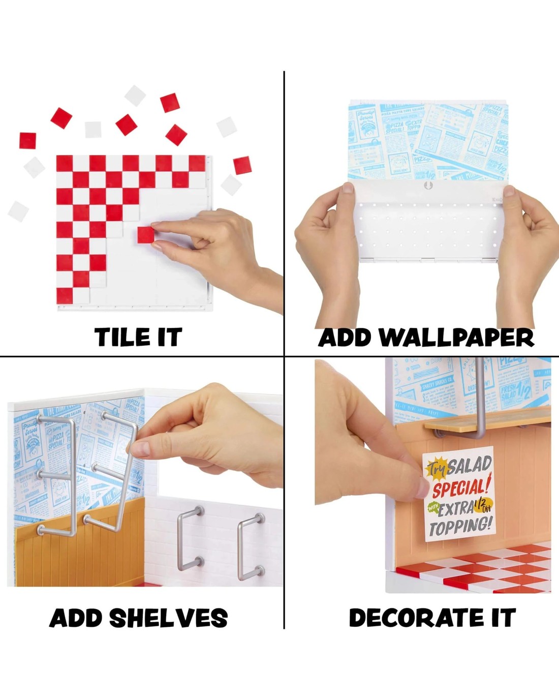 The world of MGA's Miniverse is expanding—literally! Make It Mini Spaces lets you build, customise, and showcase your favourite mini creations like never before. With fully customisable packs, you can now create the perfect setting for your Miniverse collectibles and bring your imagination to life. This mini pizza shop has its own distinct style and aesthetic. Choose to keep to the theme of the space or customise the theme! Whether you're dreaming of a cozy café or a pet store or maybe a shoe shop, there's a space for every mini—and every mood. Each pack is filled with everything you need to build your dream space: two wall panels, one floor panel, two wallpaper designs, tiling, a piece of furniture, and a handful of surprise ingredients to bring your scene to life. It's the ultimate unboxing experience! Follow the step-by-step guide included in each pack to assemble your space. The instructions feature pro tips for customising your setup, so your mini environment is as unique as you are. Collect the different Make It Mini Spaces Furniture packs and include them in your spaces! (sold separately) Got multiple spaces? Stack them up to create your very own Maxiverse! Combine different styles and spaces to build a multi-level world of mini magic. From bakeries to plant shops, themed parties to Hogwarts™ hangouts—you decide the vibe. Swap wallpapers, rearrange tiles, and mix & match materials between packs. There are endless ways to design and personalize your space. (other sets sold separately) Your Miniverse experience has just levelled up! Each pack includes a collectible NFC card. Download the app and play the Make It Mini game. Collect the different NFC cards to gain more coins and unlock in-game items! Once your space is built and styled, it's time for the main event—showing off your Miniverse masterpieces in a display that's as impressive as your minis. DISCLAIMER: ALL ingredients are NOT edible. Ages 8 +