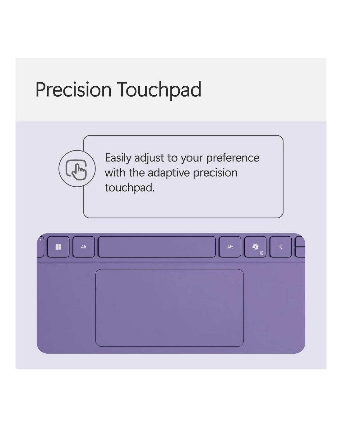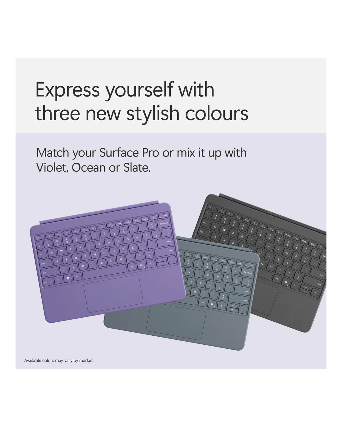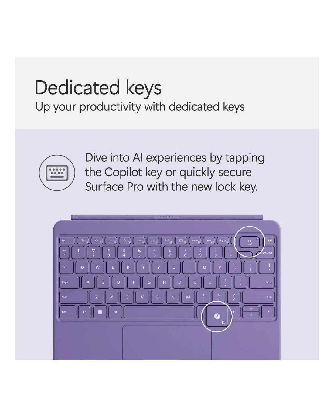 Turn Surface Pro 12-inch Keyboard¹ into a powerful laptop expanding your usage options. Full-sized backlit, modern keyboard with dedicated special keys to enhance your experience. Features a smooth-matte palm rest and a back cover made of soft Alcantara, and includes the Surface Slim Pen, the go-to companion for any task, whether it’s for creativity or productivity.