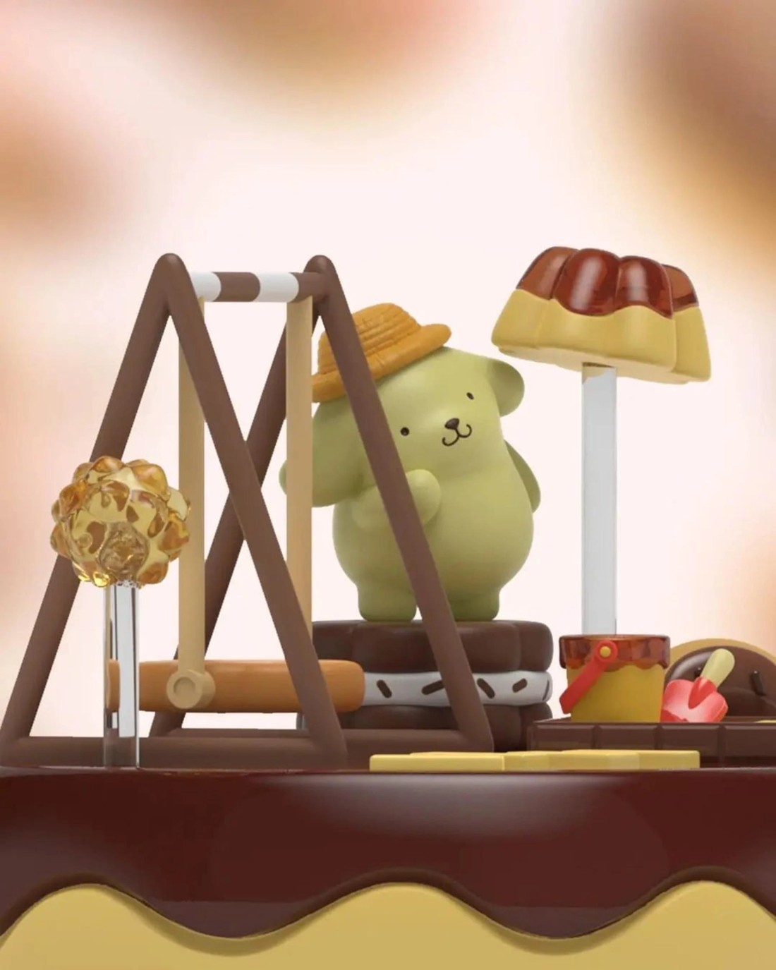 Welcome to Kandyland! This dream-like collection, birthed as an extension from Mighty Jaxx's Kandy universe, takes characters on a journey to a sugary Kandy wonderland, sparked by their own dreams. These dreams are brought to life through a diorama encased within their heads, depicting the rich imagination that each of these Sanrio Characters exemplify. Our first ever Kandyland collection features the ever-endearing characters from the Sanrio universe, with the likes of Hello Kitty, Cinnamoroll, Kuromi, My Melody, Pompompurin & Pochacco. Don't miss out on this chance to experience the sweetest dreams of them all with Hello Kitty and her friends! Get ready for a cozy, caramel-inspired adventure with Kandyland: Sanrio Pompompurin. Encased in a glitter-filled dome shaped like his signature beret, this diorama transports Pompompurin to a decadent world of desserts and warm, chocolatey hues. Overflowing with sweet details, it's the perfect collectible for fans of Sanrio's lovable golden retriever. Standing 12.25 cm tall, the diorama showcases Pompompurin sitting on a chocolate swing surrounded by dessert-themed elements like a custard lamp post, a chocolate biscuit bench, and a tray of sweet treats. The glittery dome sparkles over a donut-shaped base dripping with chocolate glaze, creating a rich, warm aesthetic. The set features fun, detachable accessories, including a pudding dessert, chocolate pieces, and caramel accents that perfectly match Pompompurin's love for all things sweet. Add the Kandyland: Sanrio Pompompurin to your collection and let this sweet and cozy display bring warmth and happiness to your day! Ages 6 +