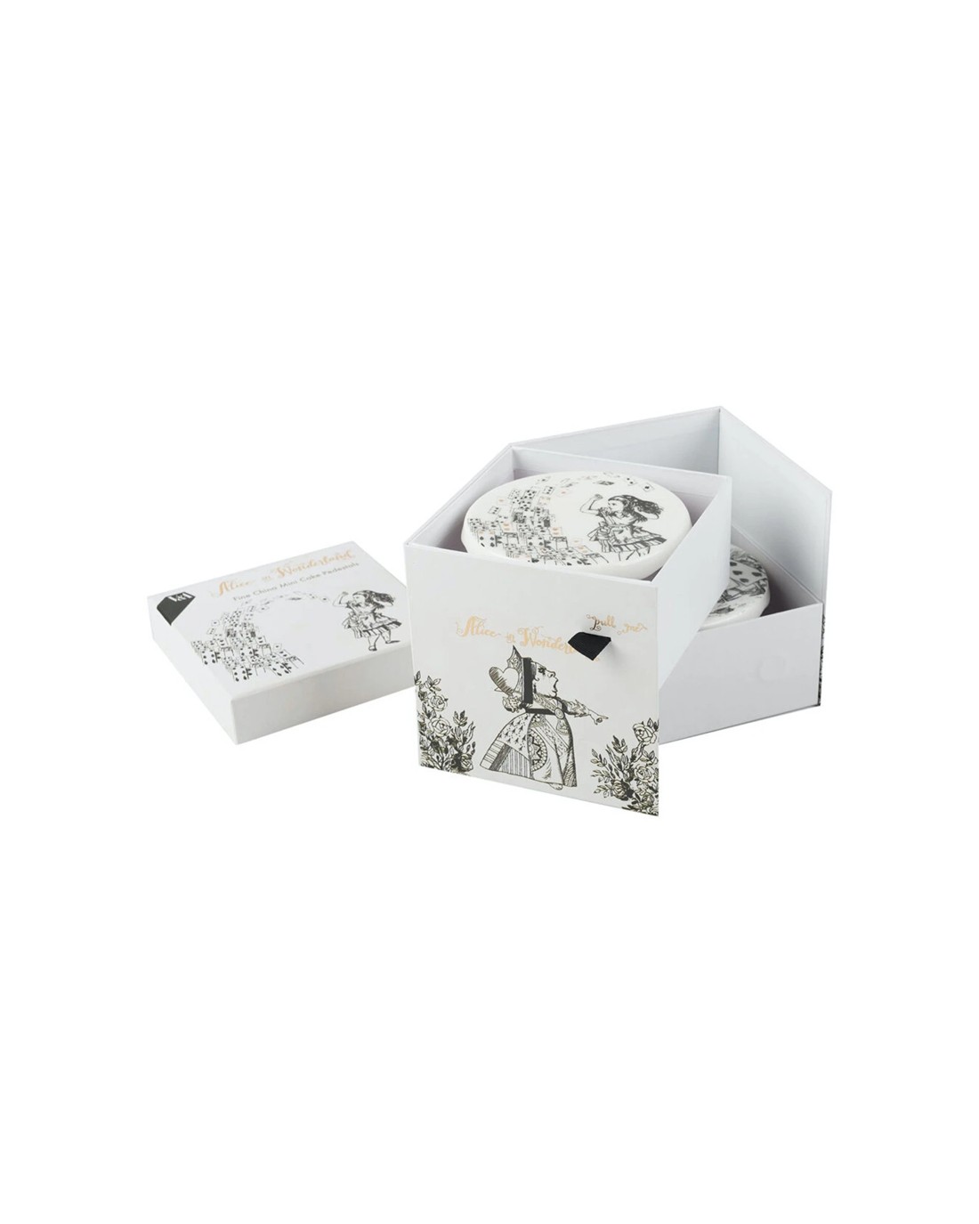 Made from fine china, these stands feature detailed black and white illustrations inspired by Sir John Tenniel's artwork, depicting the Queen of Hearts, Alice, and playing cards. The stands are finished with luxurious gold decal accents, adding a sophisticated touch to your presentation.