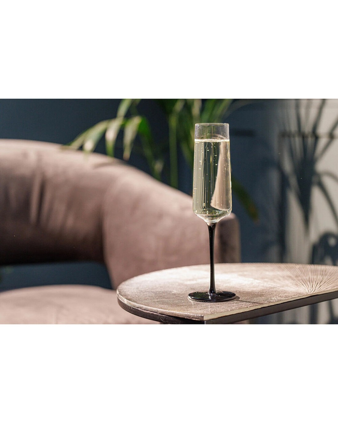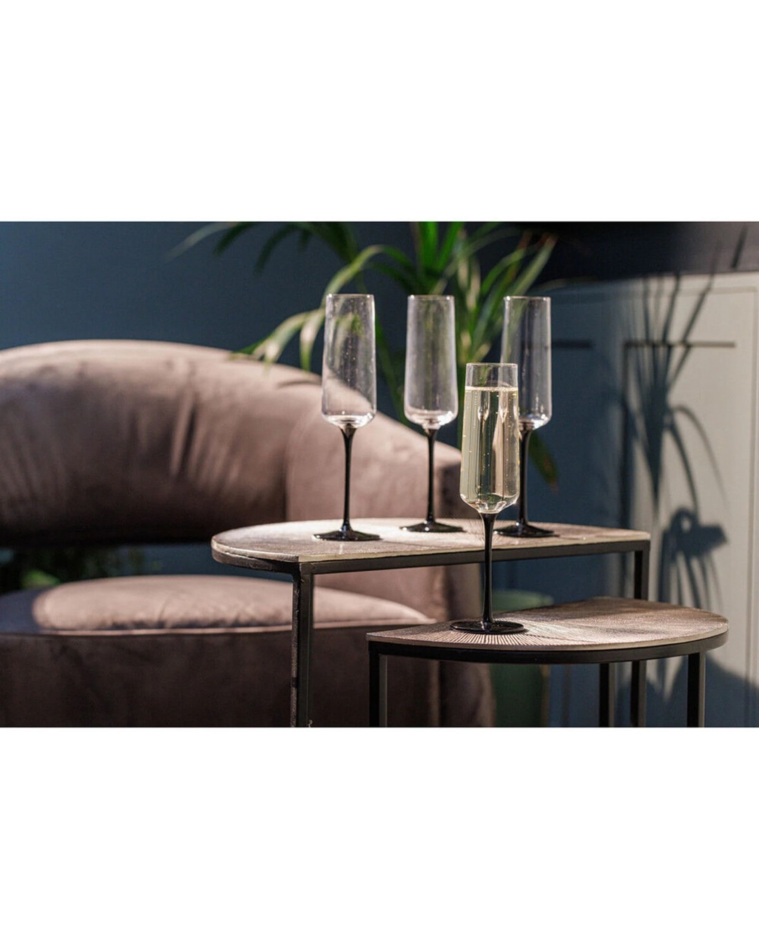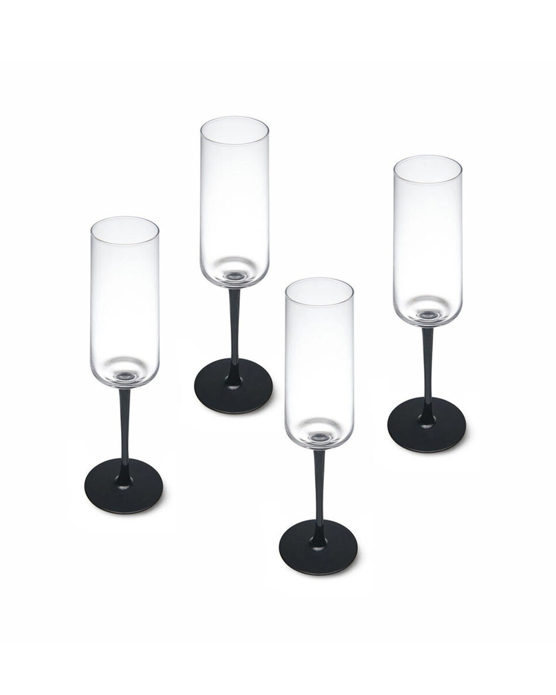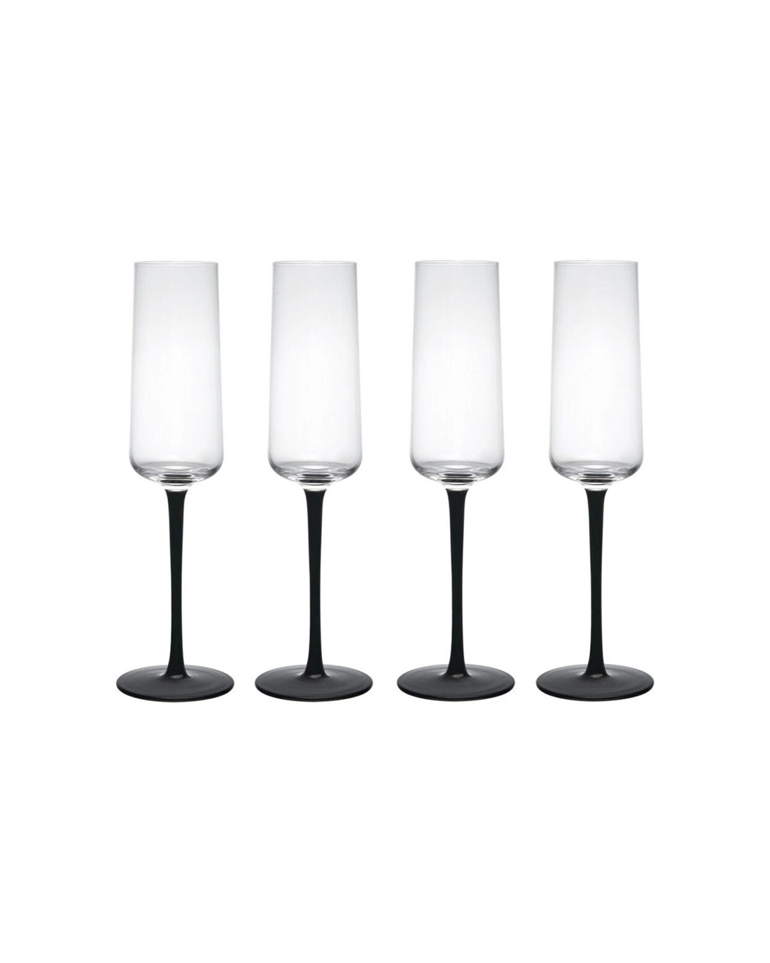 Each flute features a slender, tall bowl with a contrasting matte black stem, adding a modern and sophisticated touch to your table setting. The set includes four glasses, perfect for entertaining guests or enjoying intimate moments.