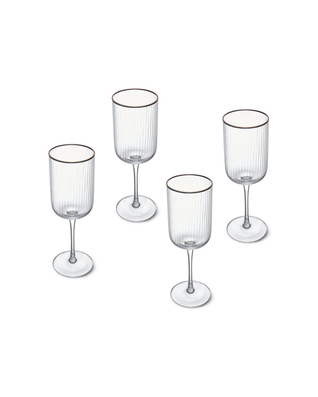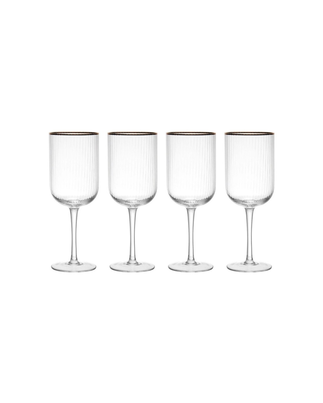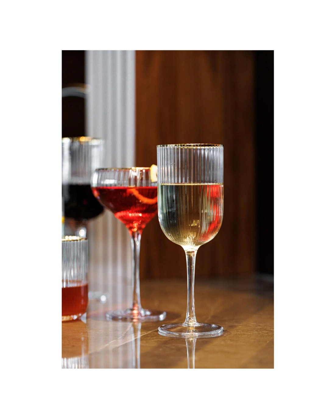 Each 400ml white wine glass features a shimmering ribbed pattern on the bowl, complemented by a refined gold rim on the top. The tall, slender stem adds to the sophisticated appearance, enhancing your wine-drinking experience with a touch of glamour.