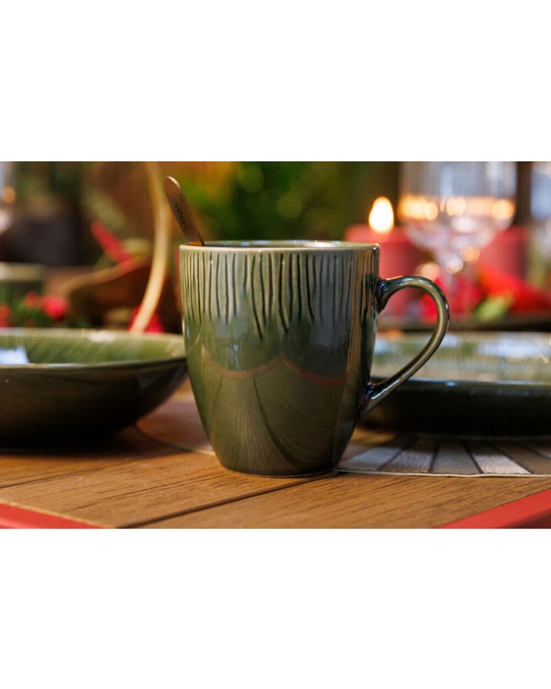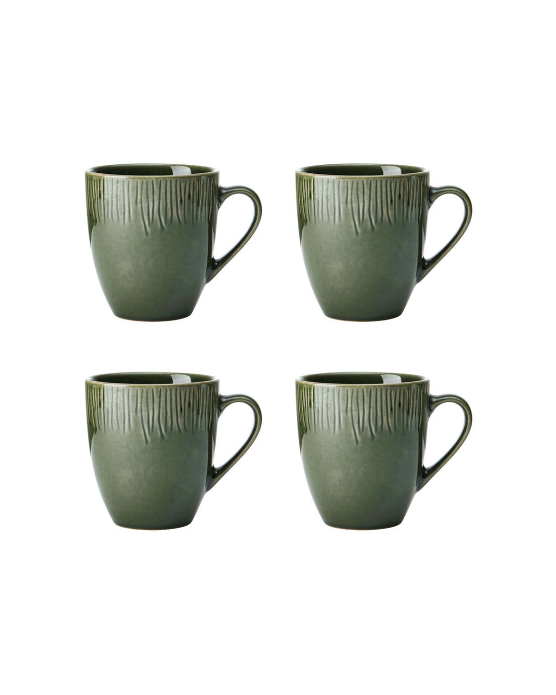 The set includes four stoneware mugs, each with a capacity of 420ml, making them ideal for generous servings of coffee, tea, or other hot drinks. The mugs feature a vibrant green glaze with debossed organic detailing, bringing botanical elements into your kitchen or dining space. Their sturdy stoneware construction ensures long-lasting use, while the textured natural-inspired pattern adds decorative appeal.