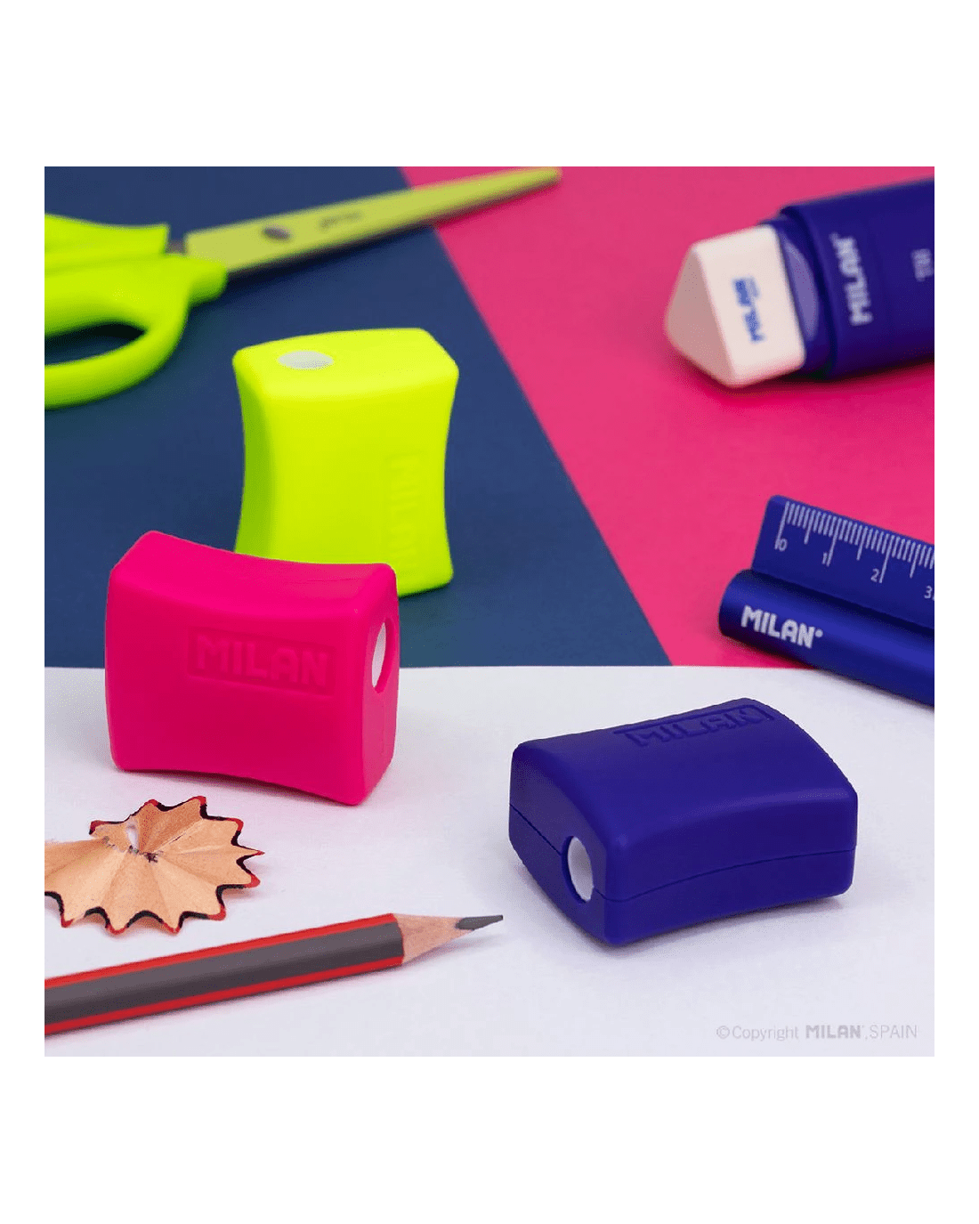 This Milan Pencil Sharpener has 2 holes for standard and jumbo pencils. There’s a deposit inside to neatly store shavings, and it comes in a range of bright, primary colours for an eye-catching addition to your pencil case.