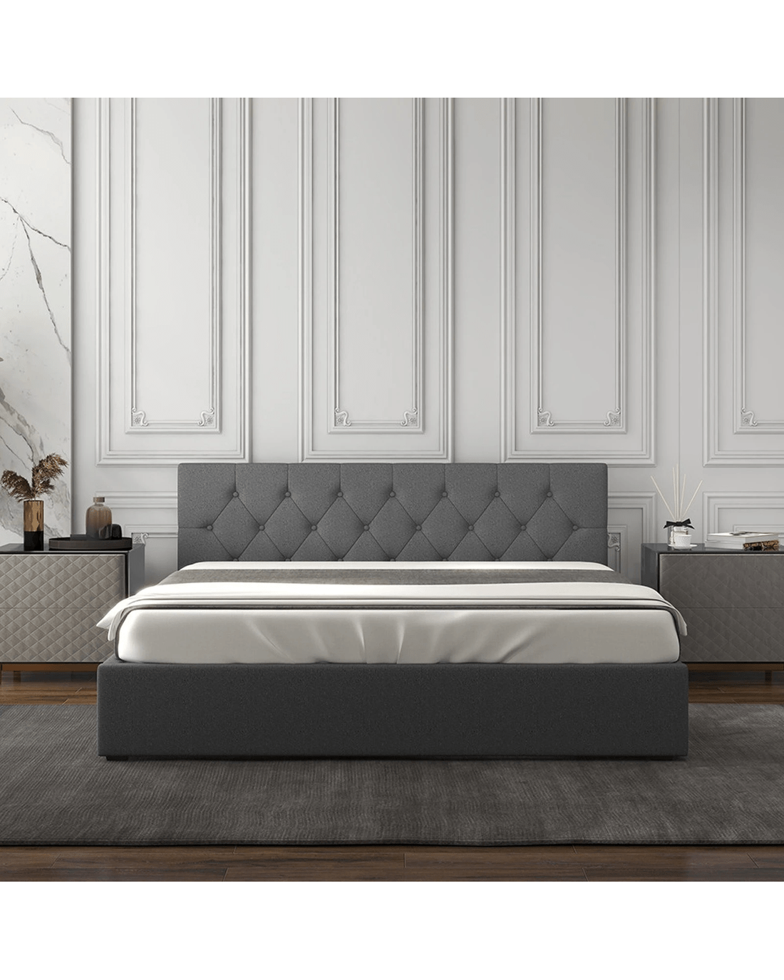 This bed frame features an easy-to-use gas lift mechanism, providing access to a spacious under-bed storage area. The Scandinavian-style tufted headboard and high-quality fabric upholstery add a modern touch, while the steel frame and strategically placed slats ensure durability and support.