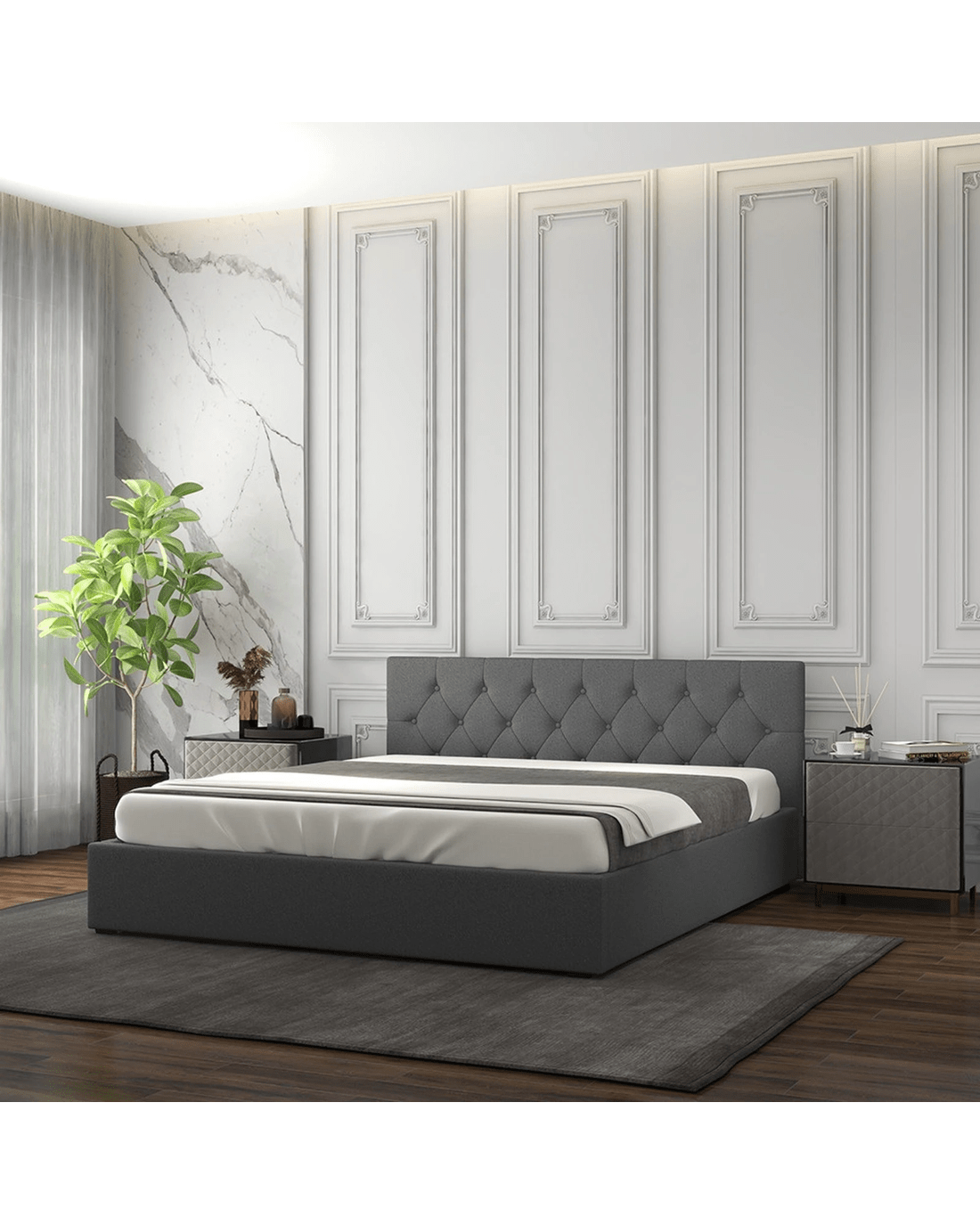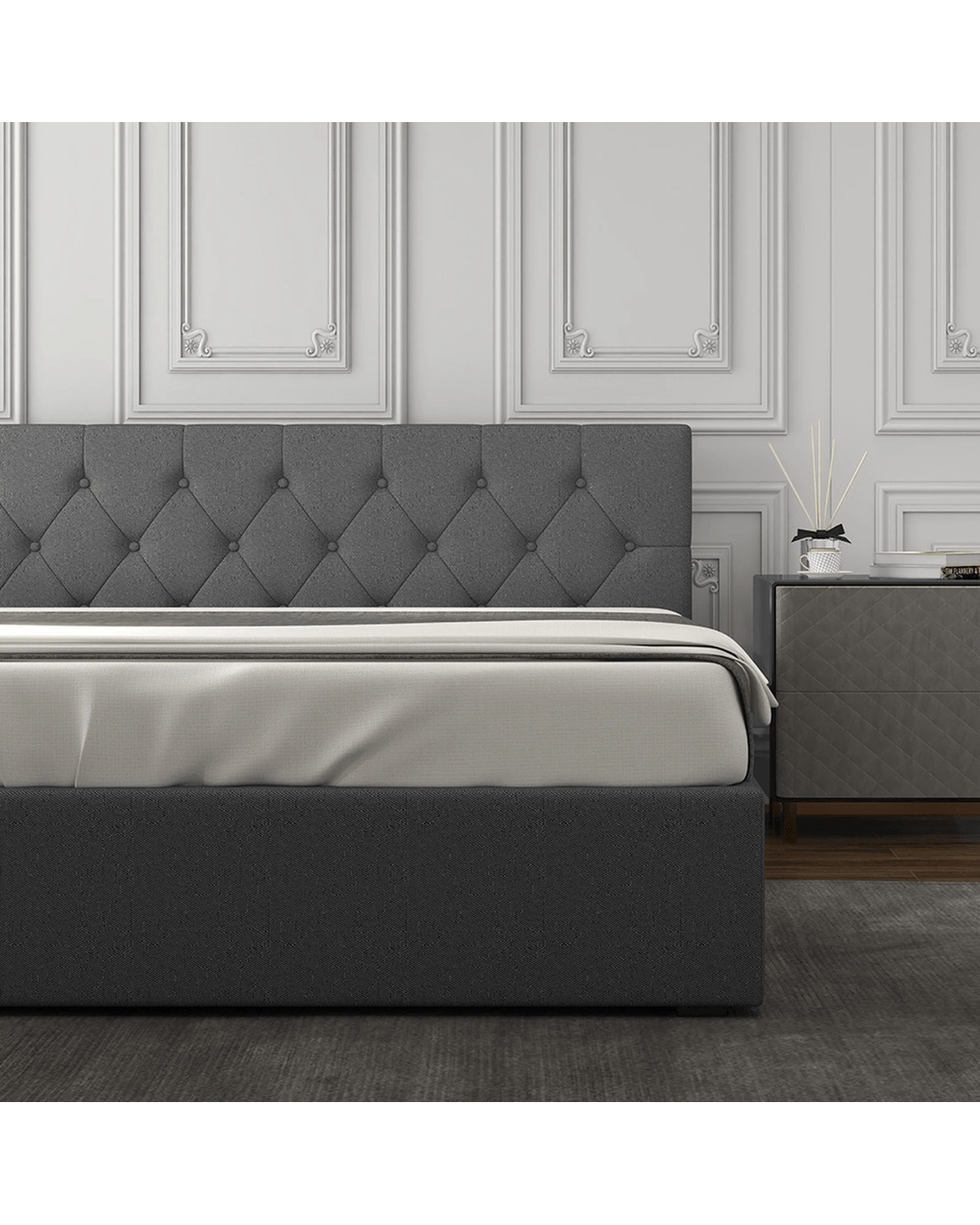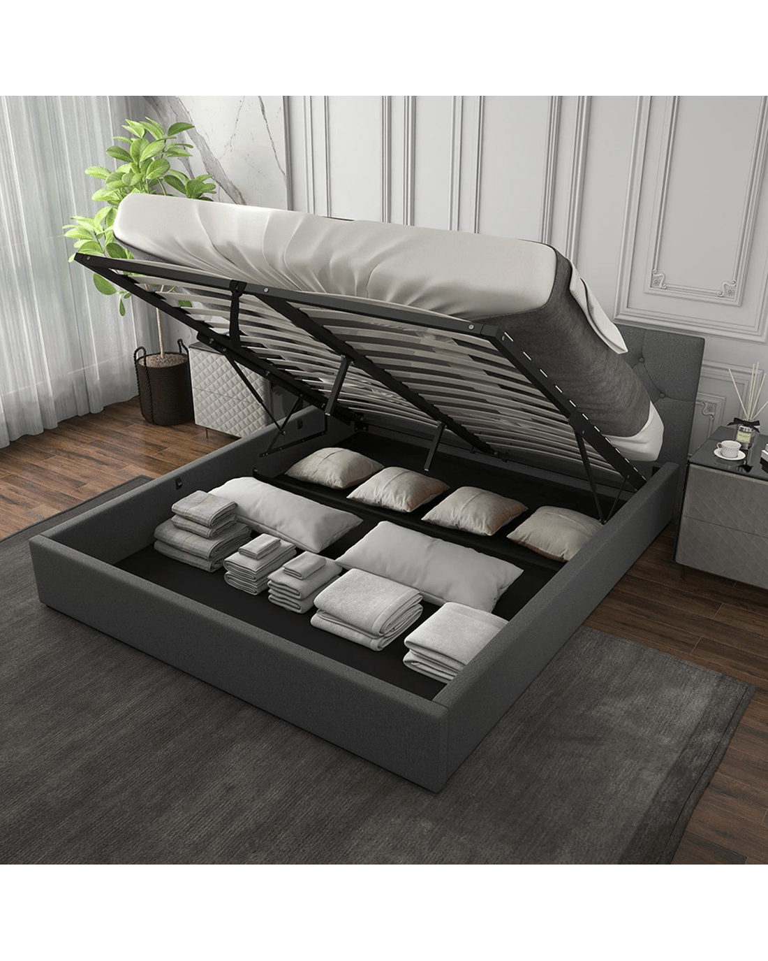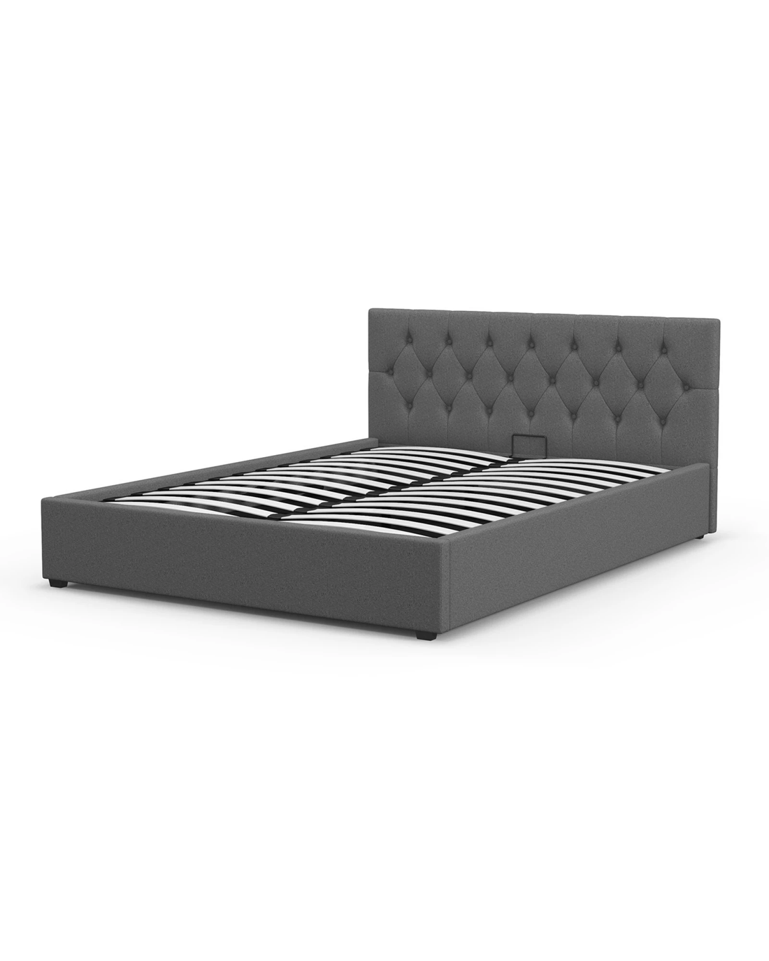 This bed frame features an easy-to-use gas lift mechanism, providing access to a spacious under-bed storage area. The Scandinavian-style tufted headboard and high-quality fabric upholstery add a modern touch, while the steel frame and strategically placed slats ensure durability and support.
