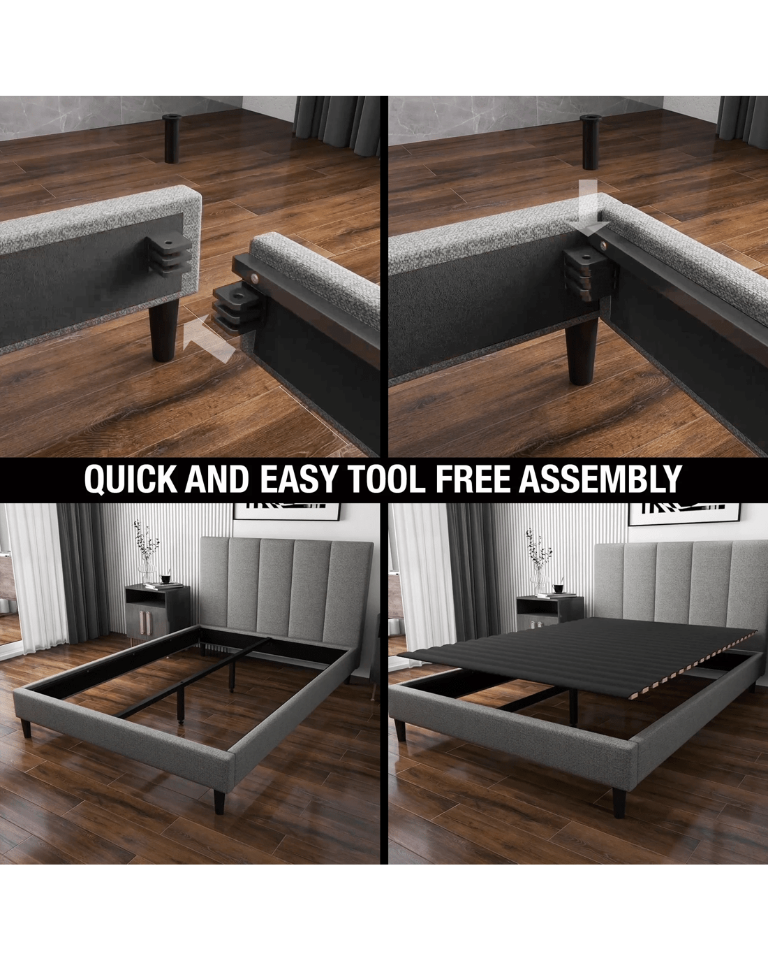 Your bedroom deserves a bed that feels as good as it looks. This Quick-Assembly Upholstered Bed Frame with Headboard is designed to bring together modern style, everyday comfort and fuss-free setup.