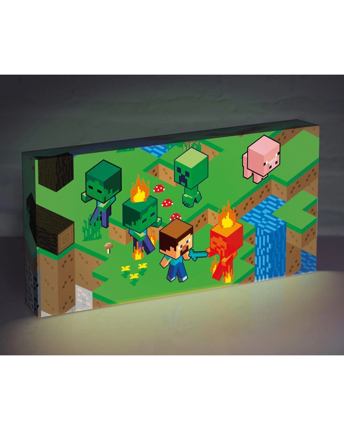 This unique Minecraft Light-up Canvas will look amazing standing on your desk, shelf or hanging on your wall. The LEDs inside make the original artwork light up giving an ambient glow & highlighting the details of the design.