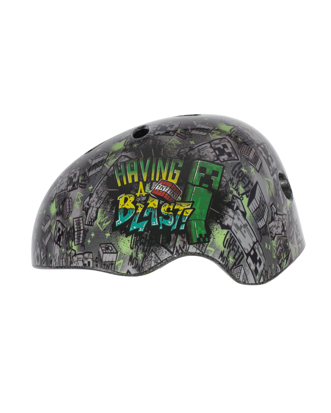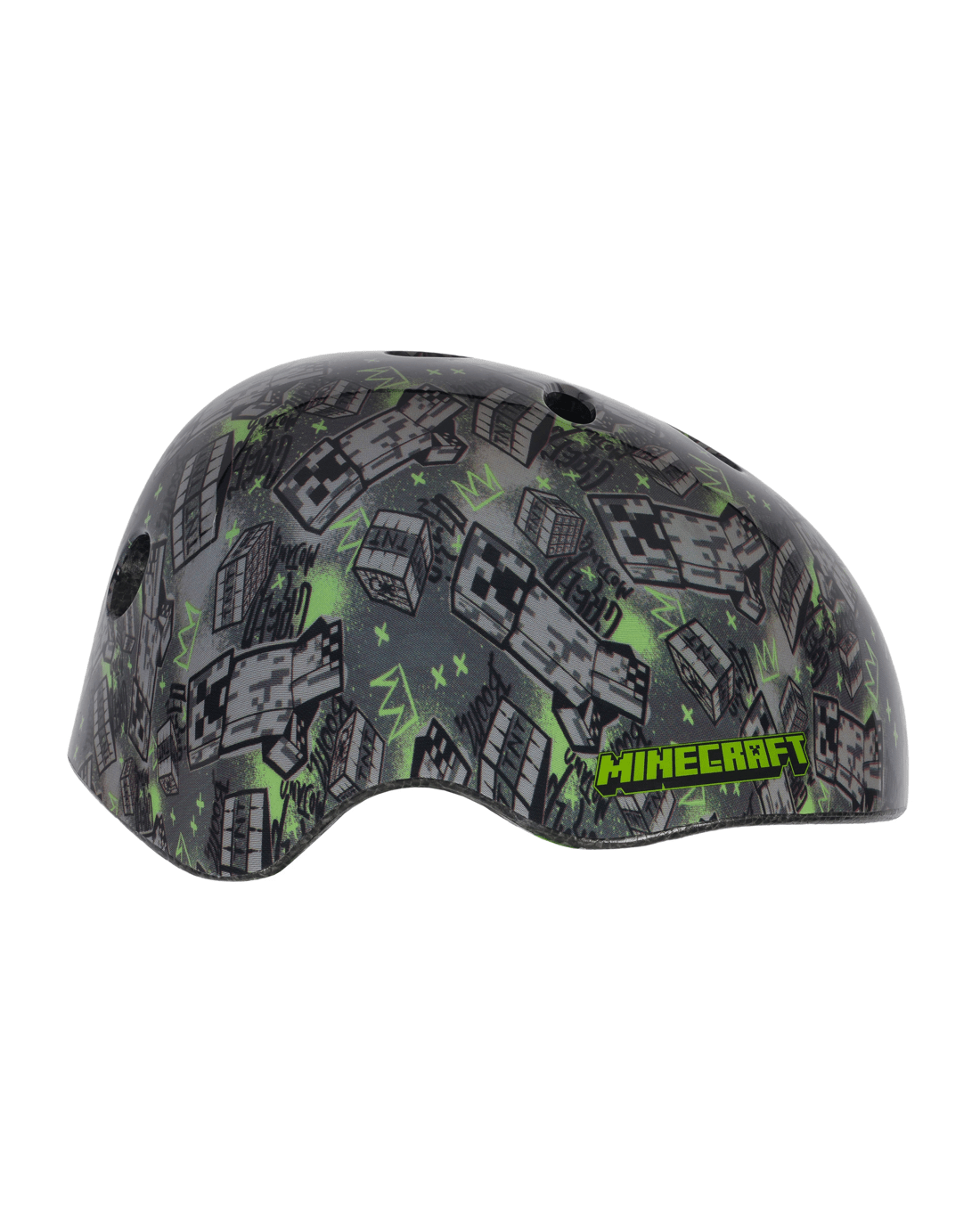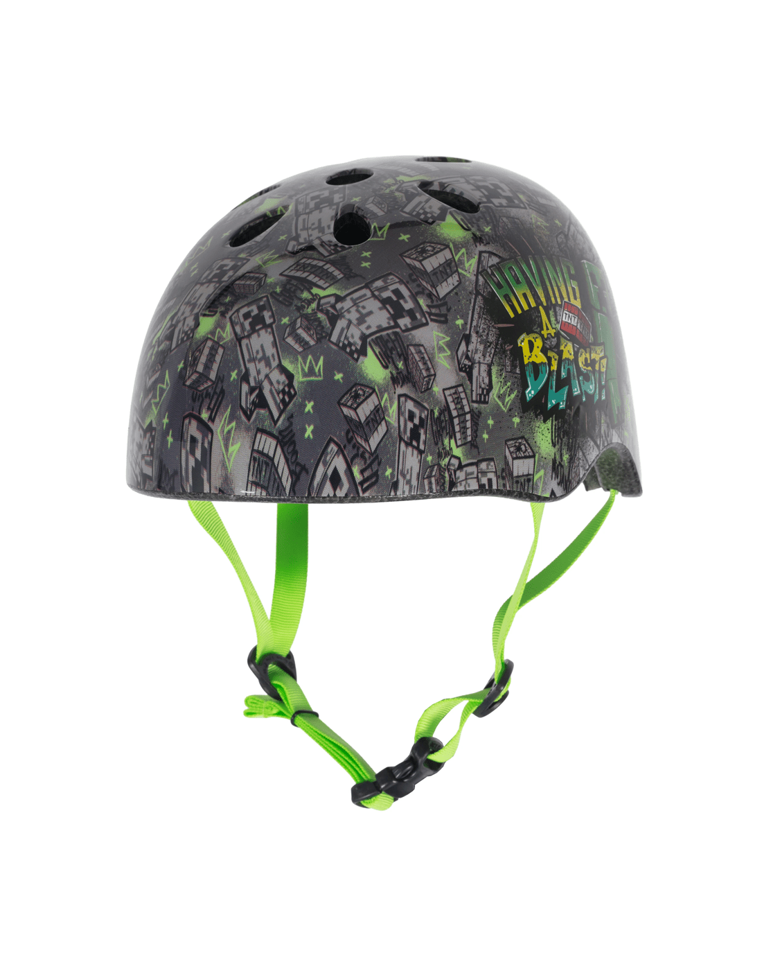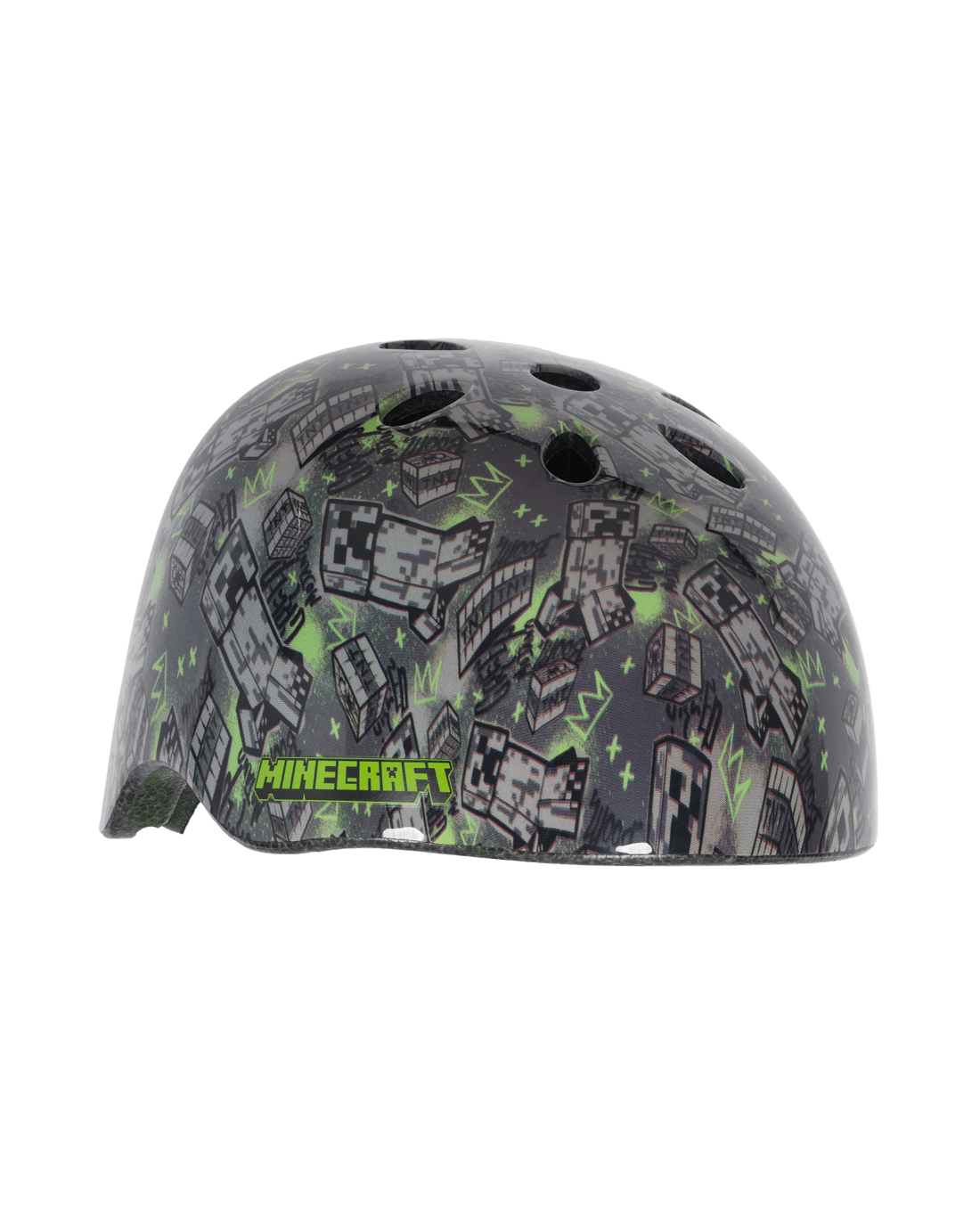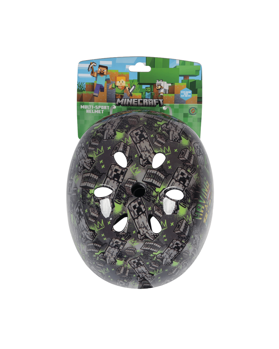 Gear up for adventure with the Minecraft Multi Sport Helmet! Featuring a bold design with a Creeper all-over print and a large decal on the side, you will have a blast while staying safe during every ride. Designed with nine air vents to help keep riders cool and comfortable, it offers a secure fit for everyday action. Sized to fit head sizes 54-58cm, it is perfect for biking, scootering and skating fun.
