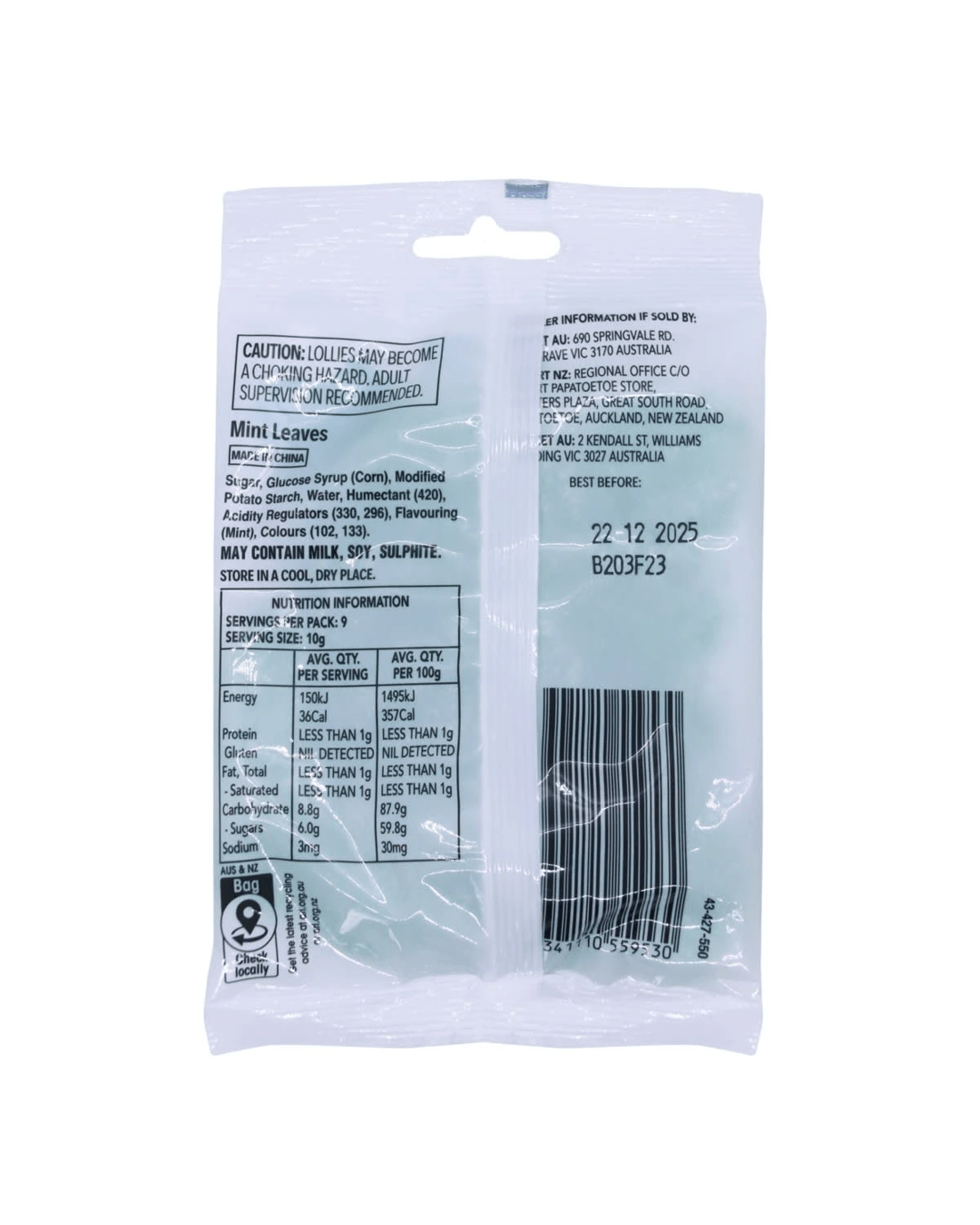 • Ingredients: Sugar, Glucose Syrup (Corn), Modified Potato Starch, Water, Humectant (420), Acidity Regulators (330, 296), Flavouring (Mint) and Colours (102, 133)