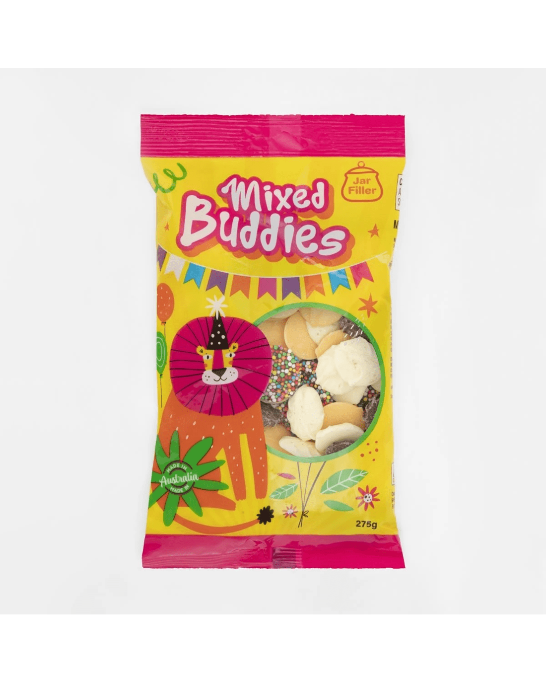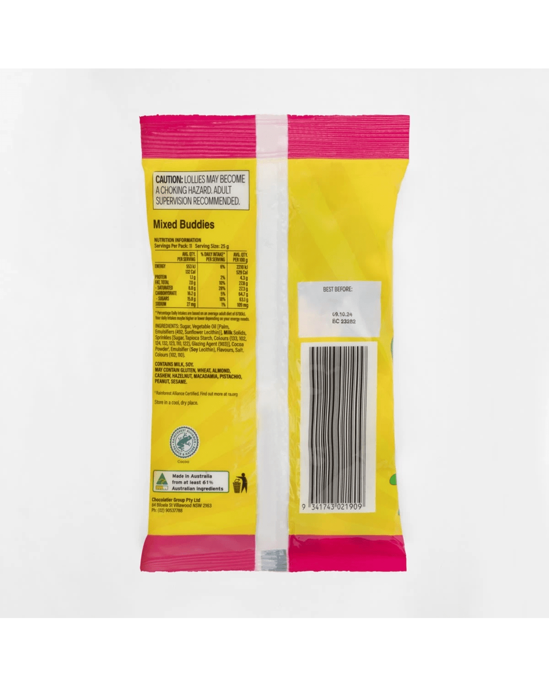 Mixed Buddies is a pack of assorted choc confectionery with Choc Buds, White Choc Buds, Caramel Buds and Choc Sprinkles.