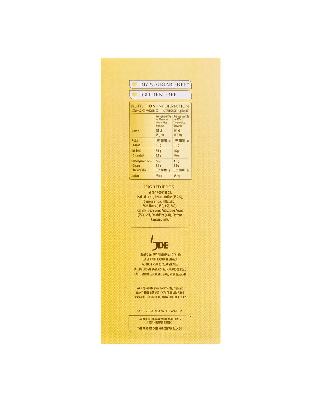 • Ingredients include Sugar, Coconut Oil, Maltodextrin, Instant Coffee (16.2%), Glucose Syrup, Milk Solids, Stabilisers (1450, 452, 340), Caramelised Sugar, Anticaking Agent (551), Salt, Emulsifier (481), Flavour.