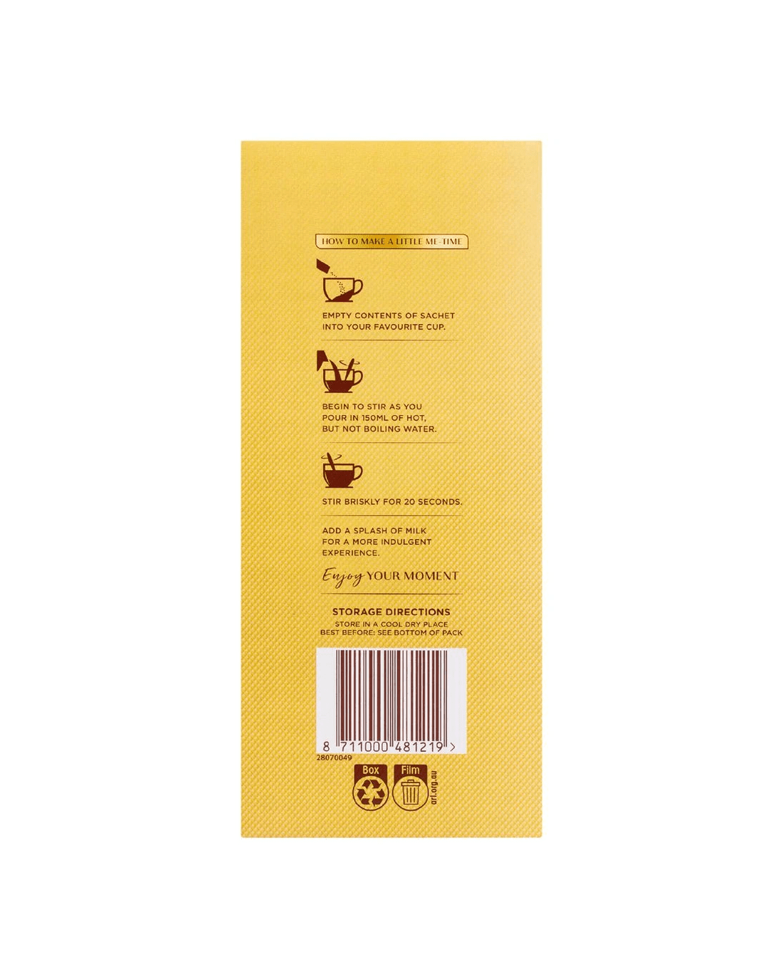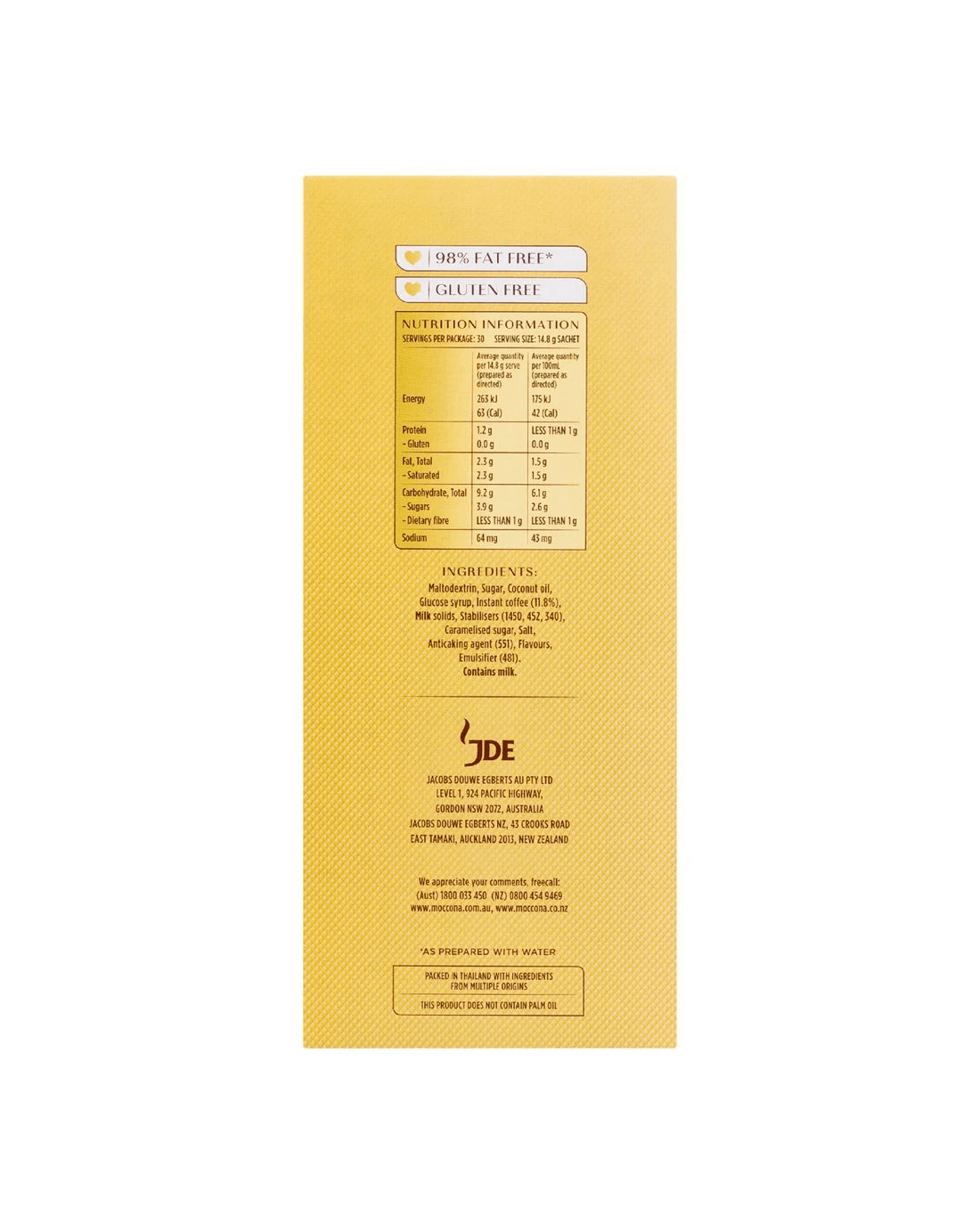 • Ingredients include Maltodextrin, Sugar, Coconut Oil, Glucose Syrup, Instant Coffee (11.8%), Milk Solids, Stabilisers (1450, 452, 340), Caramelised Sugar, Salt, Anticaking Agent (551), Flavours, Emulsifier (481).