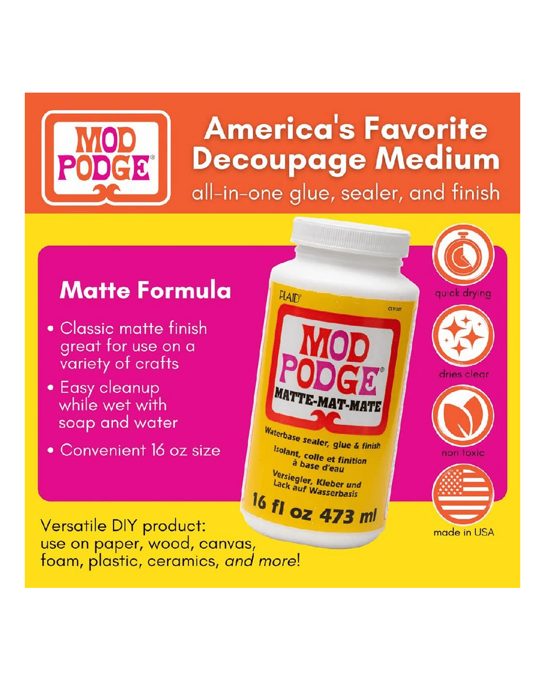 Preserve the beauty of your decoupage paper projects and more with this Mod Podge Matte sealer glue and finish. It's quick-drying and dries clear, leaving a smooth, matte finish. Plus, you can use this decoupage glue to create decoupage tissue paper projects as well as projects using wood, fabric, plastic, and canvas.