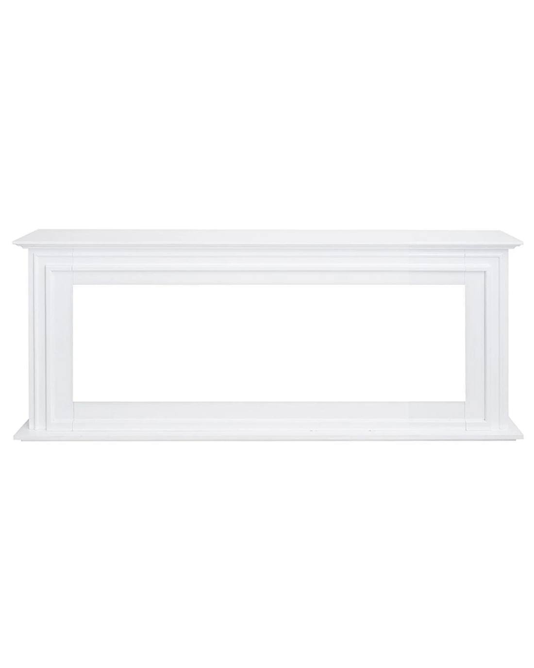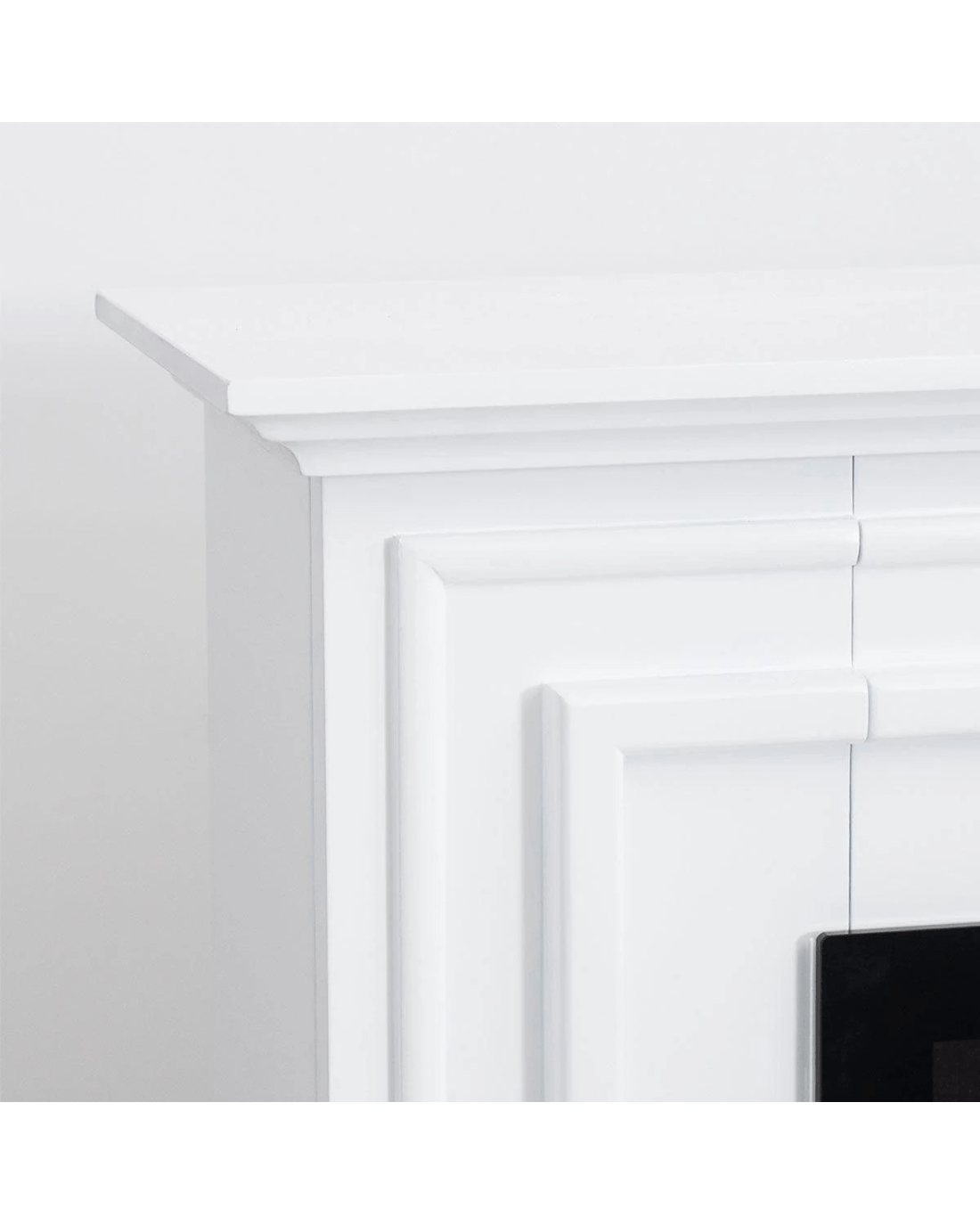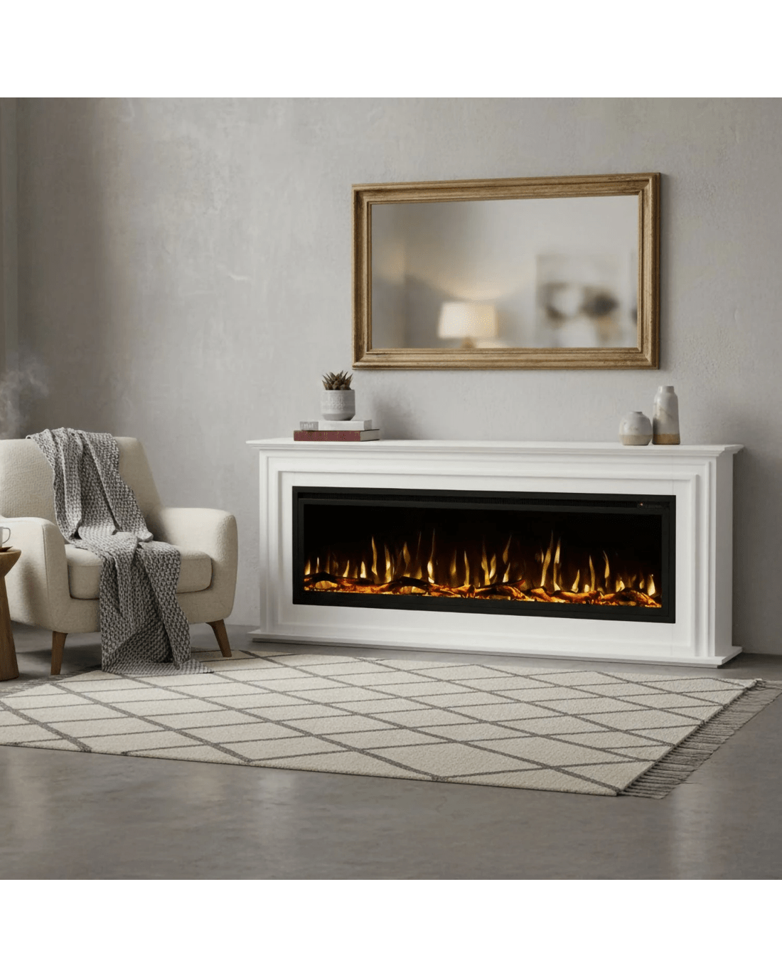 The Concerto 60-inch electric fireplace suite combines the Eton white mantel with a 60-inch Concerto electric fireplace insert. The fireplace features adjustable flame colours, fuel bed lighting and two heating levels. Flame effect can operate with or without heat, providing ambience and practical heating year-round.
