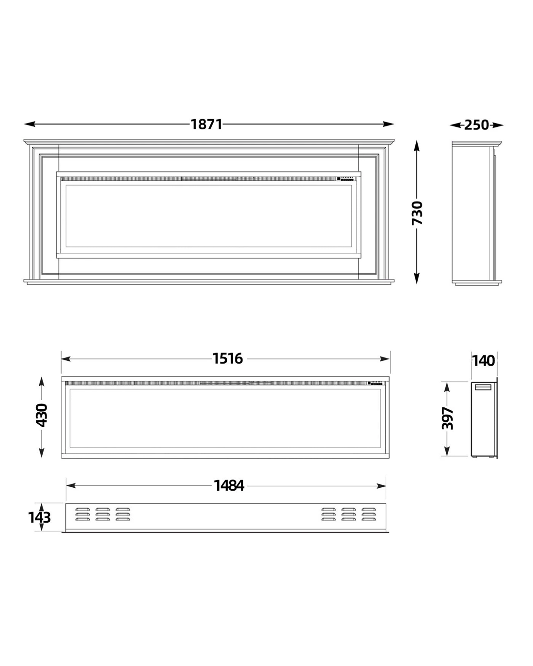- Fireplace suite dimensions: 187.1W x 25D x 73H cm