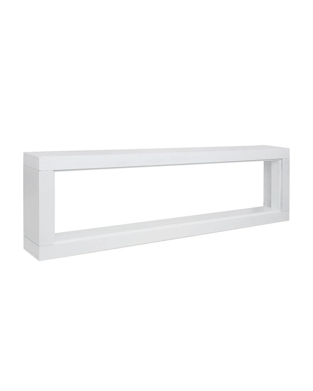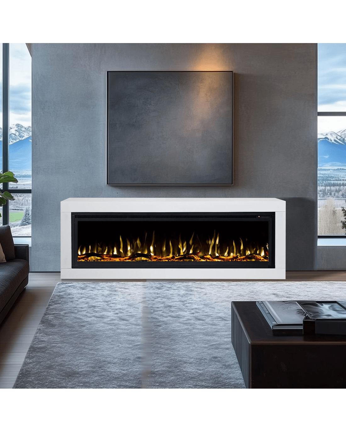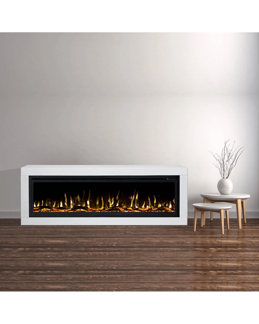 The Concerto electric fireplace suite combines the Horizon white mantel with a 60-inch Concerto electric fireplace insert. The fireplace features adjustable flame colours, fuel bed lighting and electric heating, providing both visual ambience and practical warmth. The flame display can operate with or without heat for year-round use.