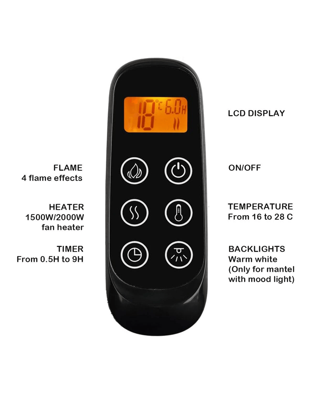 - Remote Control Operation: Operate flame, heating and lighting functions using the included remote control with LCD display.