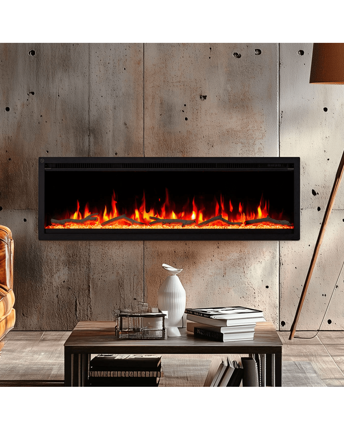 - Adjust flame colour, brightness, and heat settings via remote control or built-in manual controls