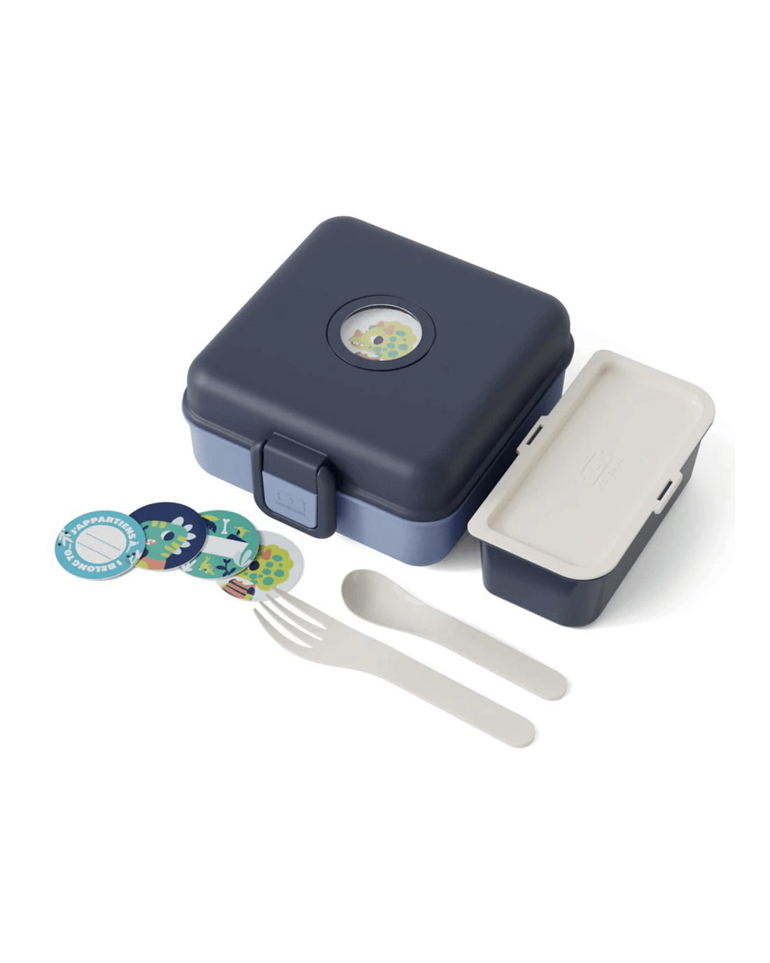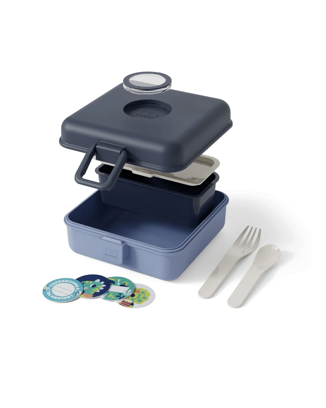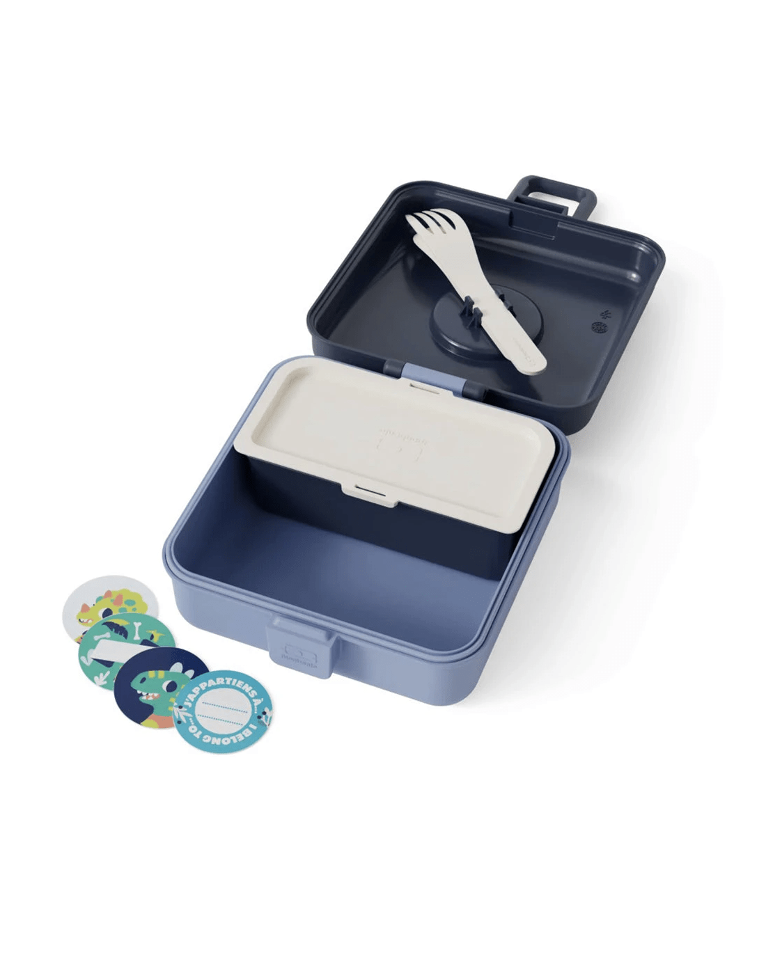 No more crushed snacks at the bottom of school bags! The Monbento Mb Sandwich Lunch Box Snacky - Blue Infinity is designed to keep food fresh, organised, and fun. Big enough to fit a whole sandwich, a juice box, and extra treats, it’s the perfect companion for school days, outings, and adventures. With its Blue Infinity colour and customisable lid, this snack box lets kids express their personality while enjoying their favourite foods. Practical, compact, and easy to use, it’s built to handle busy days and hungry little foodies. Key Features - Customisable lid with 4 interchangeable tokens included - Option to add your child’s name to avoid mix-ups at school - Spacious design fits a full sandwich, snacks, and a juice box - Built-in fork and spoon stored neatly under the lid - Removable compartment with lid to separate foods or add extras - Crumb-proof seal keeps school bags clean - Large latch that’s easy for small hands to open and close - Compact, flat shape for easy carrying - BPA-free and food-grade materials - Dishwasher-safe for easy cleaning - Lifetime warranty Additional Information - Not suitable for children under 4 years old - BPA-free in accordance with regulations Dimensions & Capacity - Product dimensions: 16 × 14.4 × 7 cm (6.3 × 5.7 × 2.8 in) - Capacity: 850 ml / 28.8 fl oz - Weight: 277 g / 0.6 lbs What’s Included / Composition - 1 PP) - 1 container (PP) - 1 removable compartment with lid (PP) - 1 seal (silicone) - 1 fork and 1 spoon (PLA)