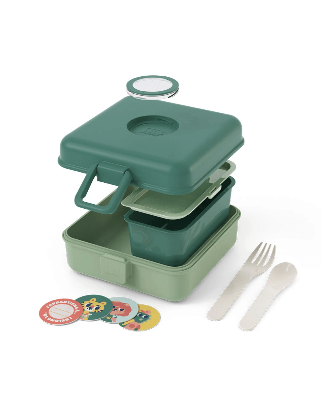 No more crushed snacks at the bottom of school bags! The Monbento Mb Sandwich Lunch Box Snacky - Green Forest is designed to keep food fresh, organised, and fun. Big enough to fit a whole sandwich, a juice box, and extra treats, it’s the perfect companion for school days, outings, and adventures. With its Green Forest colour and customisable lid, this snack box lets kids express their personality while enjoying their favourite foods. Practical, compact, and easy to use, it’s built to handle busy days and hungry little foodies. Key Features - Customisable lid with 4 interchangeable tokens included - Option to add your child’s name to avoid mix-ups at school - Spacious design fits a full sandwich, snacks, and a juice box - Built-in fork and spoon stored neatly under the lid - Removable compartment with lid to separate foods or add extras - Crumb-proof seal keeps school bags clean - Large latch that’s easy for small hands to open and close - Compact, flat shape for easy carrying - BPA-free and food-grade materials - Dishwasher-safe for easy cleaning - Lifetime warranty Additional Information - Not suitable for children under 4 years old - BPA-free in accordance with regulations Dimensions & Capacity - Product dimensions: 16 × 14.4 × 7 cm (6.3 × 5.7 × 2.8 in) - Capacity: 850 ml / 28.8 fl oz - Weight: 277 g / 0.6 lbs What’s Included / Composition - 1 PP) - 1 container (PP) - 1 removable compartment with lid (PP) - 1 seal (silicone) - 1 fork and 1 spoon (PLA)