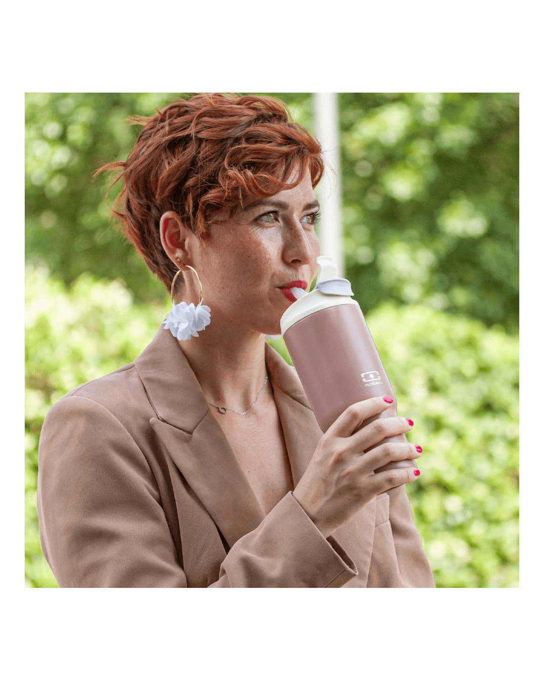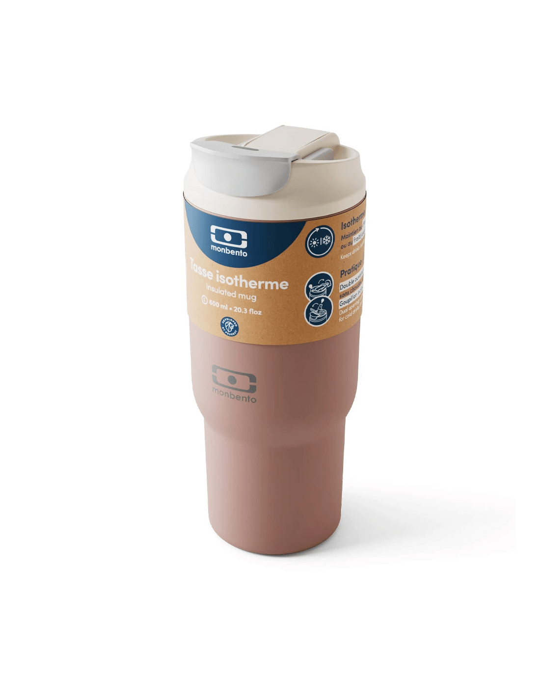 Take your favourite hot or cold drinks wherever life takes you. The Monbento Travel Mug L - Rosa Moka is designed for comfort, convenience, and performance—whether you’re commuting, working, or heading out on your next adventure. Its ergonomic shape fits comfortably in your hand, while the smart dual-function lid lets you sip or straw your drink depending on the moment. With double-wall insulation, this stainless steel travel mug keeps drinks hot for hours or refreshingly cold all day. Lightweight, leakproof, and built to last, it’s your perfect everyday companion—from morning coffee to iced tea or fresh juice. Key Features - Double-wall insulated design keeps drinks hot for up to 5 hours and cold for up to 12 hours - Dual-opening lid with sip spout for hot drinks and straw with silicone tip for cold beverages - Leakproof and airtight construction for worry-free travel - Lightweight yet durable stainless steel body - Comfortable ergonomic grip for everyday use - BPA-free and food-grade materials - Easy to clean with removable straw and included cleaning brush - Lid is dishwasher-safe; container is hand-wash only - Lifetime warranty for long-lasting confidence Specifications - Capacity: 600 ml / 20 fl oz - Weight: 315 g / 0.7 lbs - Dimensions: 8.8 × 8.5 × 21 cm / 3.5 × 3.4 × 8.3 in - Colour: Rosa Moka Materials - Container: 304 stainless steel - Lid with integrated straw tip: PP, silicone - Straw: PP - Straw cleaning brush: stainless steel, nylon What’s Included - 1 × Insulated stainless steel container - 1 × Lid with integrated straw tip - 1 × Straw - 1 × Straw cleaning brush