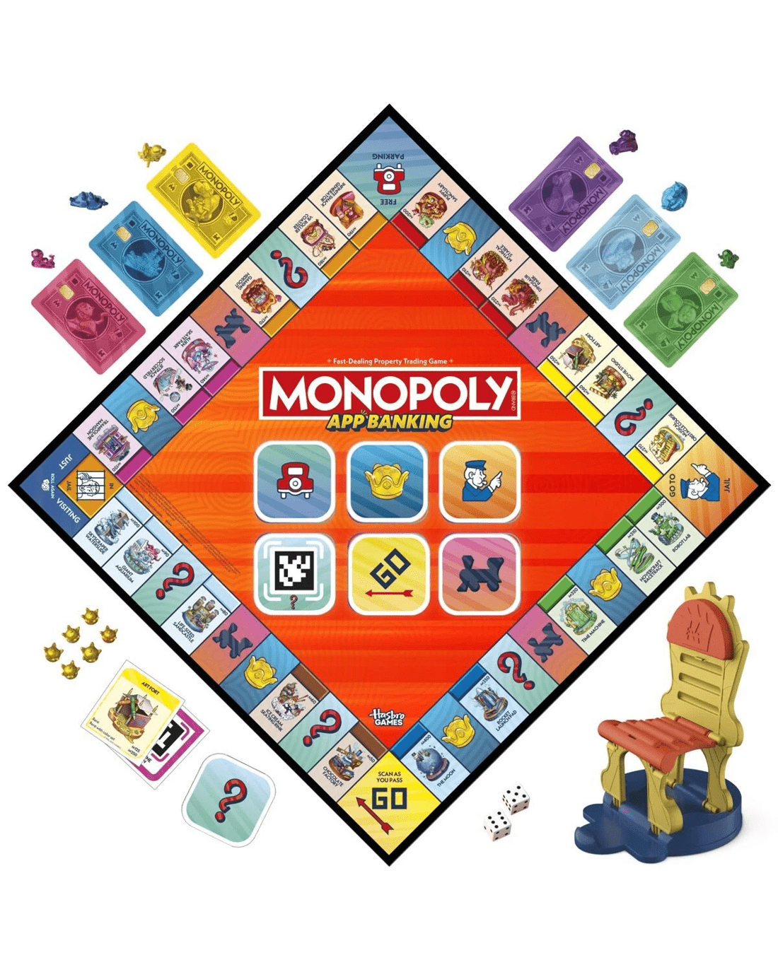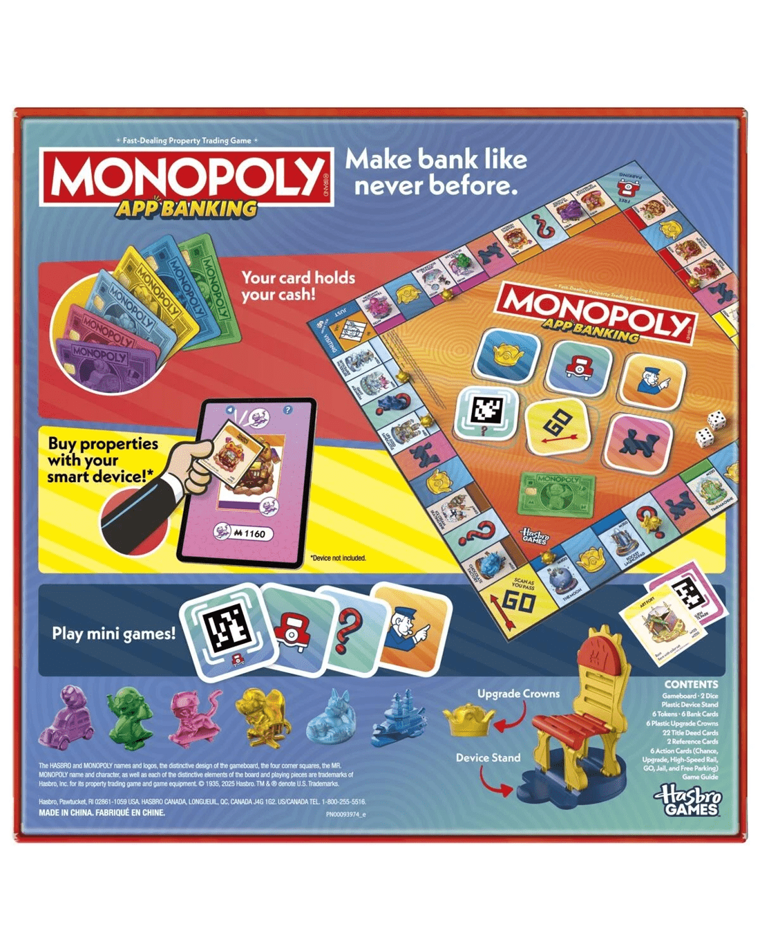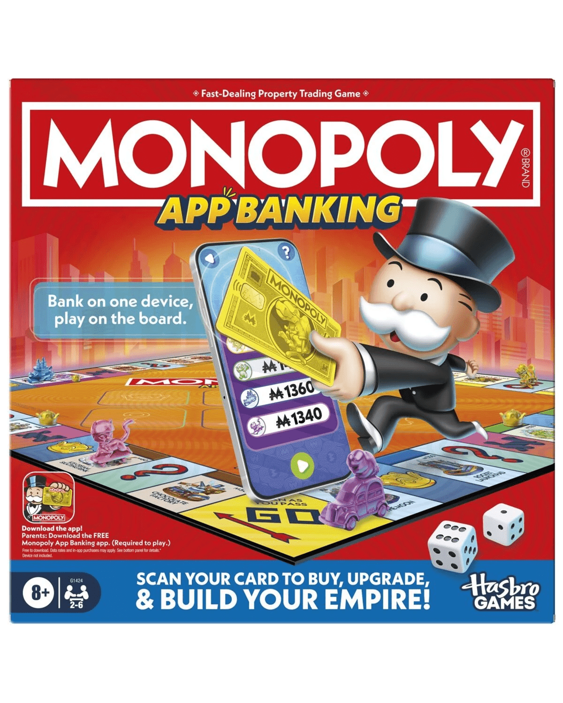 The Monopoly App Banking game is the first Monopoly game that's app-assisted for easy banking, mini games and more! In this easy to play board game for kids, players enjoy classic Monopoly gameplay on the board but the app is the banker and bank. No cash or counting! To get started, download the Monopoly App Banking app (free to download—data rates and in-app purchase may apply) and set a smart device in the included stand. (Device not included.) Choose a bank card and matching token and travel a board of whimsical properties. Scan title deeds, then buy, auction and collect rent with the app. Players can even play mini games for perks! This augmented reality app game is a fun family game for kids. Faster than the classic Monopoly game, it’s great for everyday play and family game night. App games and family games make cool gifts for kids ages 8+ who love Monopoly electronic banking and other Monopoly games.