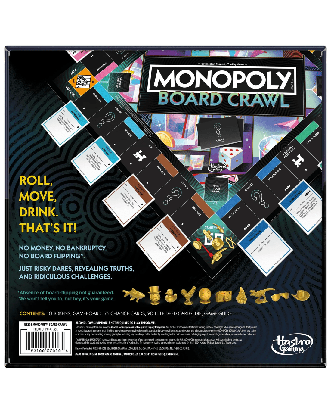 Alcohol consumption is not required to play this game. You further acknowledge that if you consume alcoholic beverages when playing this game, you are at least 21 years of age (or of legal drinking age wherever you may be playing this game) and that you will drink responsibly. You and all players further release MONOPOLY BOARD CRAWL from any claims or actions of any kind resulting from any gameplay.