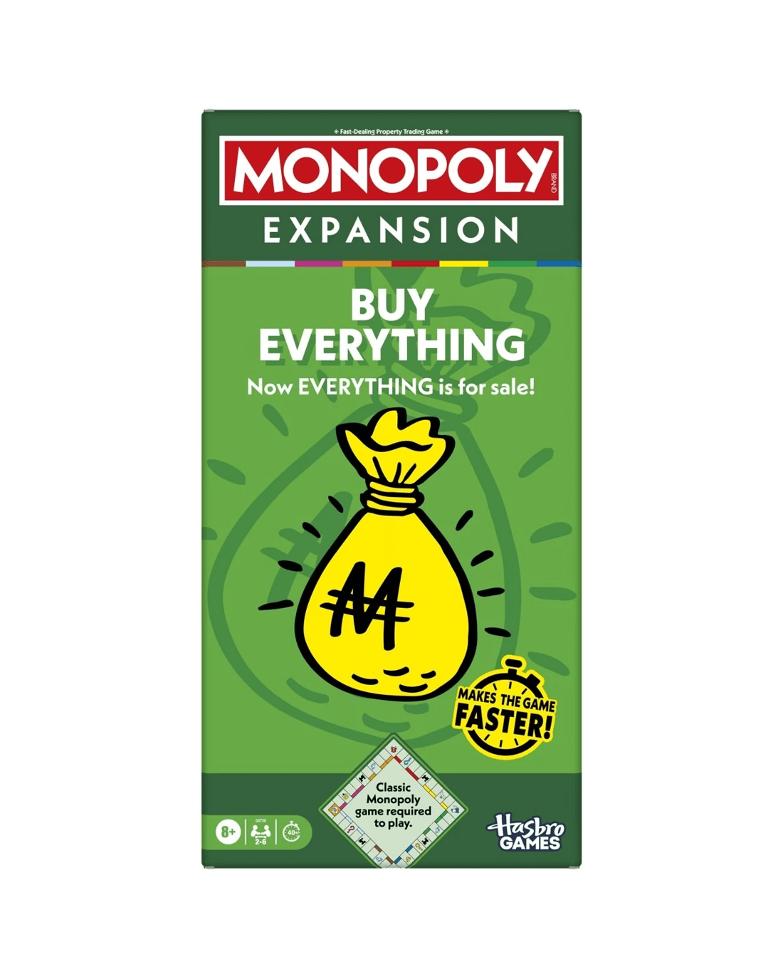 - Everything is for sale: Add this expansion to the Monopoly game and enjoy the classic Monopoly gameplay players know - plus an easy-to-learn twist! Players can buy every space, abilities and ways to win