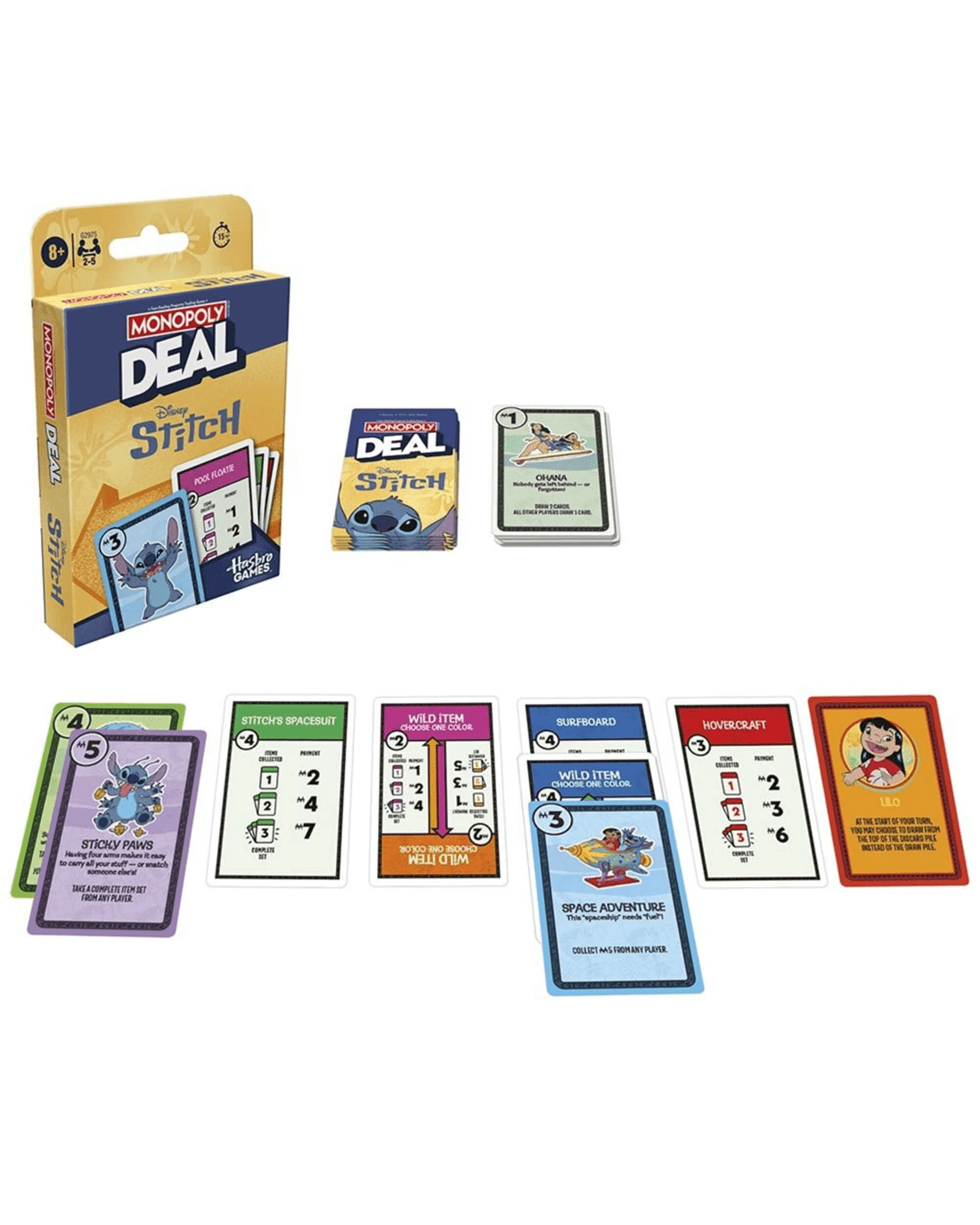 Inspired by Disney's Stitch - The Monopoly Deal: Disney Stitch Edition card game combines the fast fun of the Monopoly Deal game with characters and themes inspired by the adorable alien from Lilo & Stitch
