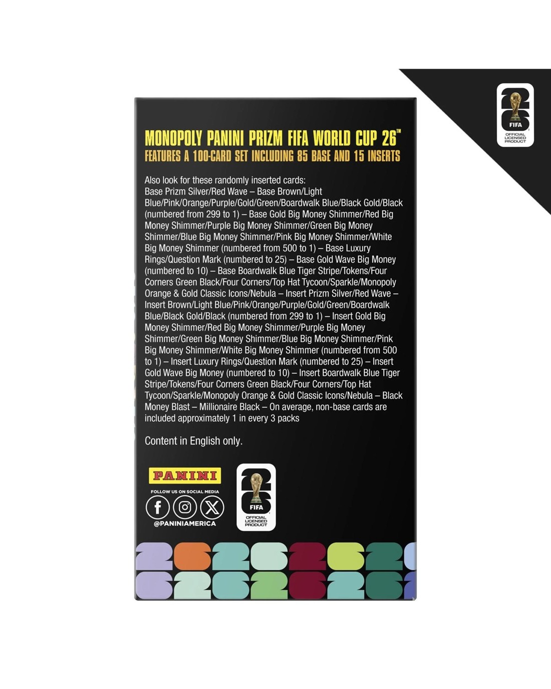 - MONOPOLY PANINI PRIZM: FIFA WORLD CUP 2026 & LEGENDS CARDS: This Monopoly Panini Prizm: FIFA World Cup Trading Cards booster box includes 24 FIFA WORLD CUP trading cards, featuring current stars and FIFA World Cup legends