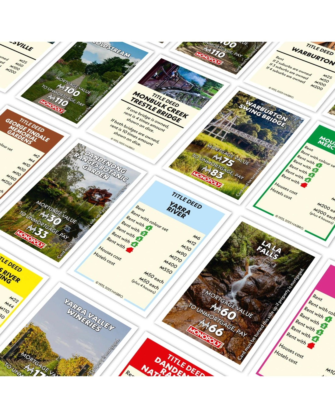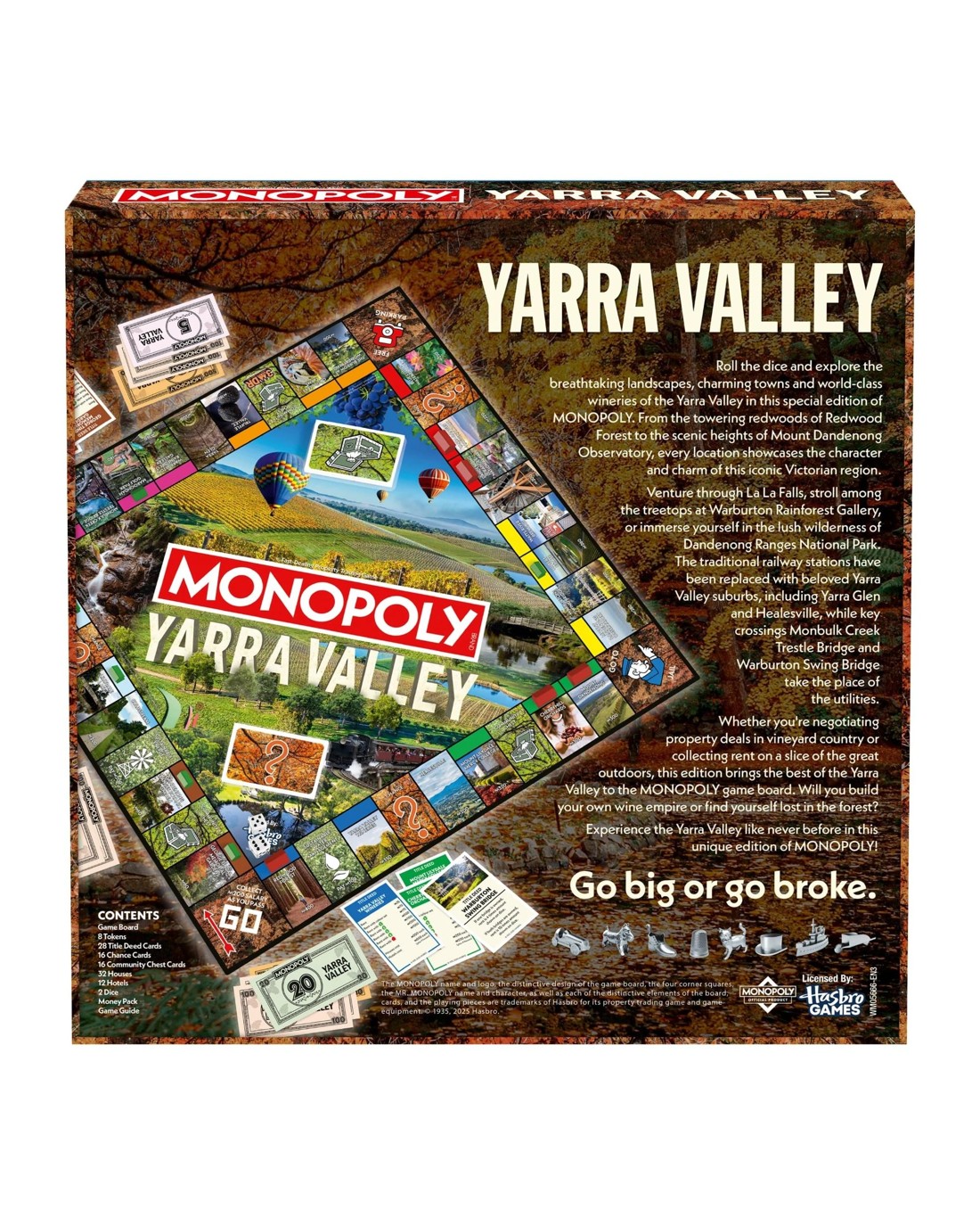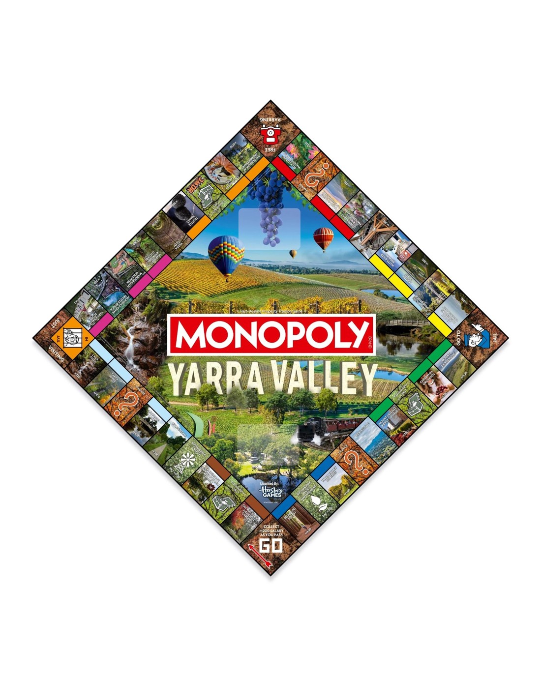 Explore Yarra Valley with this special edition of MONOPOLY. Take a tour of the city's most iconic destinations and businesses while you buy and sell your way to the top! As you move around the board you will find local utilities, landmarks, and fabulous attractions. The fun doesn't stop while exploring Yarra Valley! Ages: 8 + | Players: 2 - 6 | Playtime: 60 - 180 min