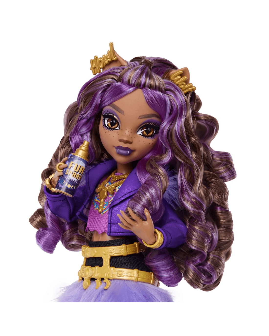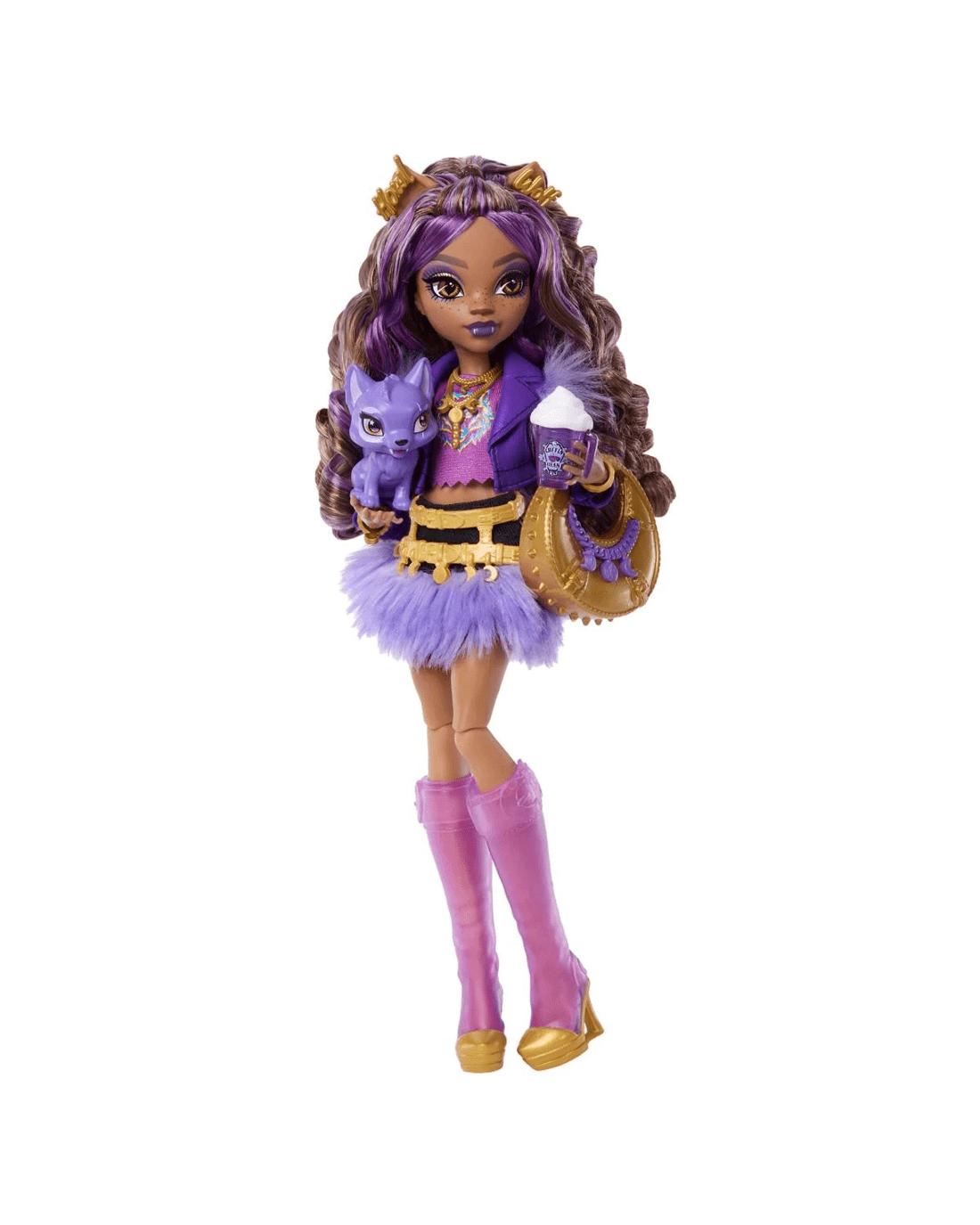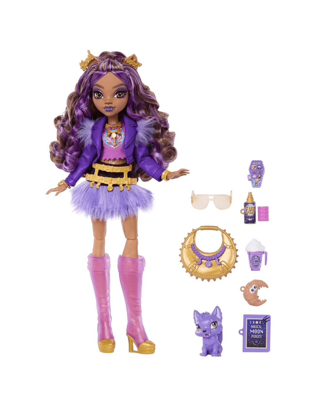 - Clawdeen Wolf doll also comes with styling and storytelling accessories: a crescent moon purse, shades, fur spray, iCoffin, moon phases book and a cosmic croissant!