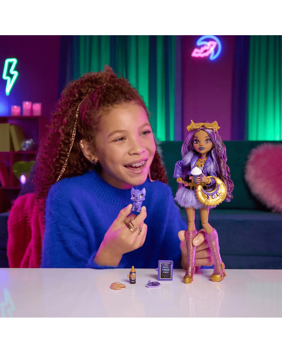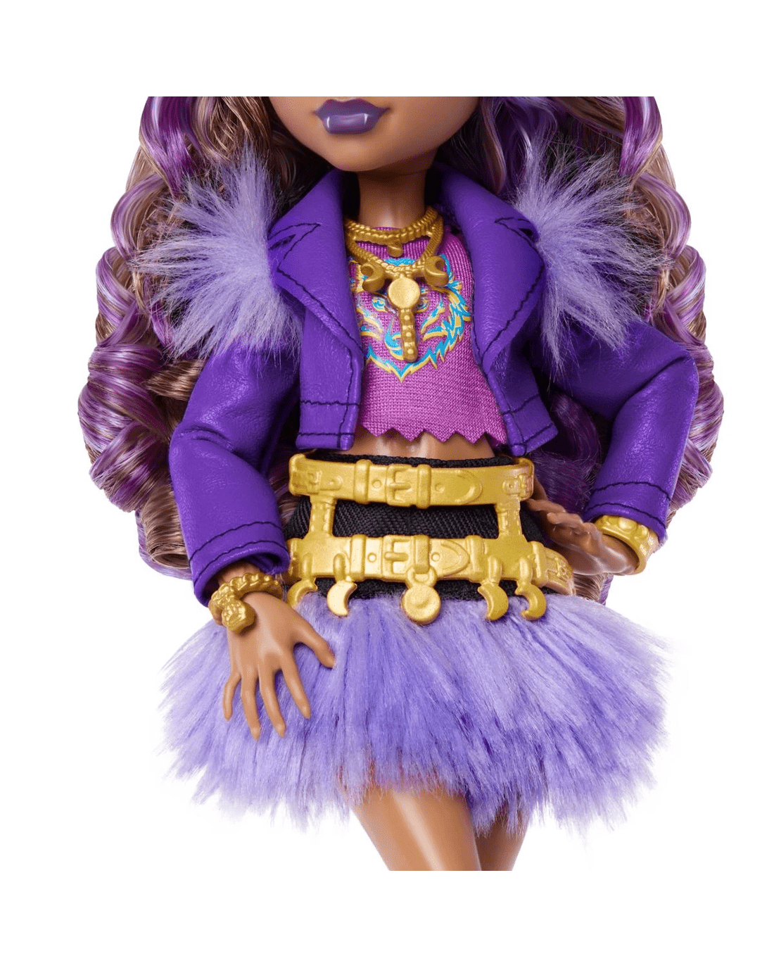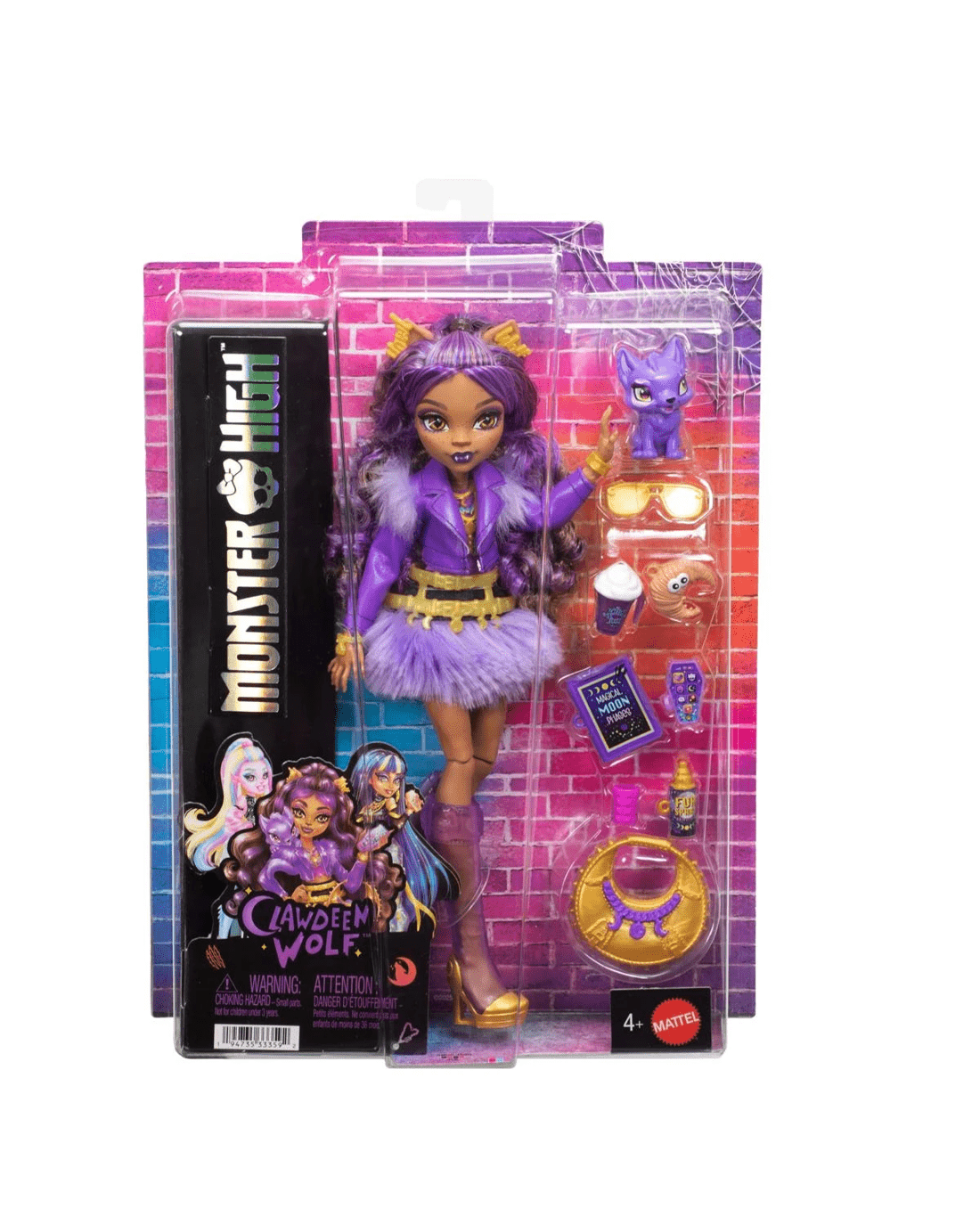 - Clawdeen Wolf doll also comes with styling and storytelling accessories: a crescent moon purse, shades, fur spray, iCoffin, moon phases book and a cosmic croissant!