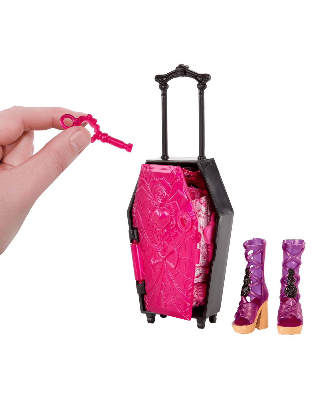 - Inside the luggage case lurks a vampire and 19 surprises. Step one: Use the key hidden in the front of the case to open the door and reveal Draculaura doll in a fangtastic resort outfit!