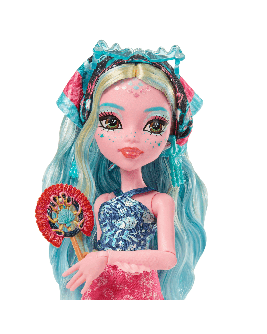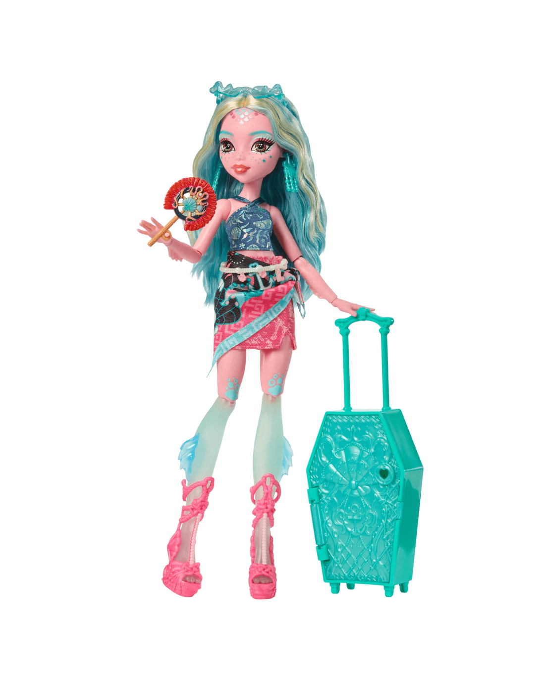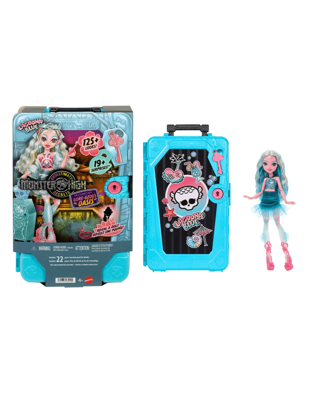 - Inside the luggage case lurks a sea monster and 19 surprises. Step one: Use the key hidden in the front of the case to open the door and reveal Lagoona Blue doll in a fan-sea resort outfit!