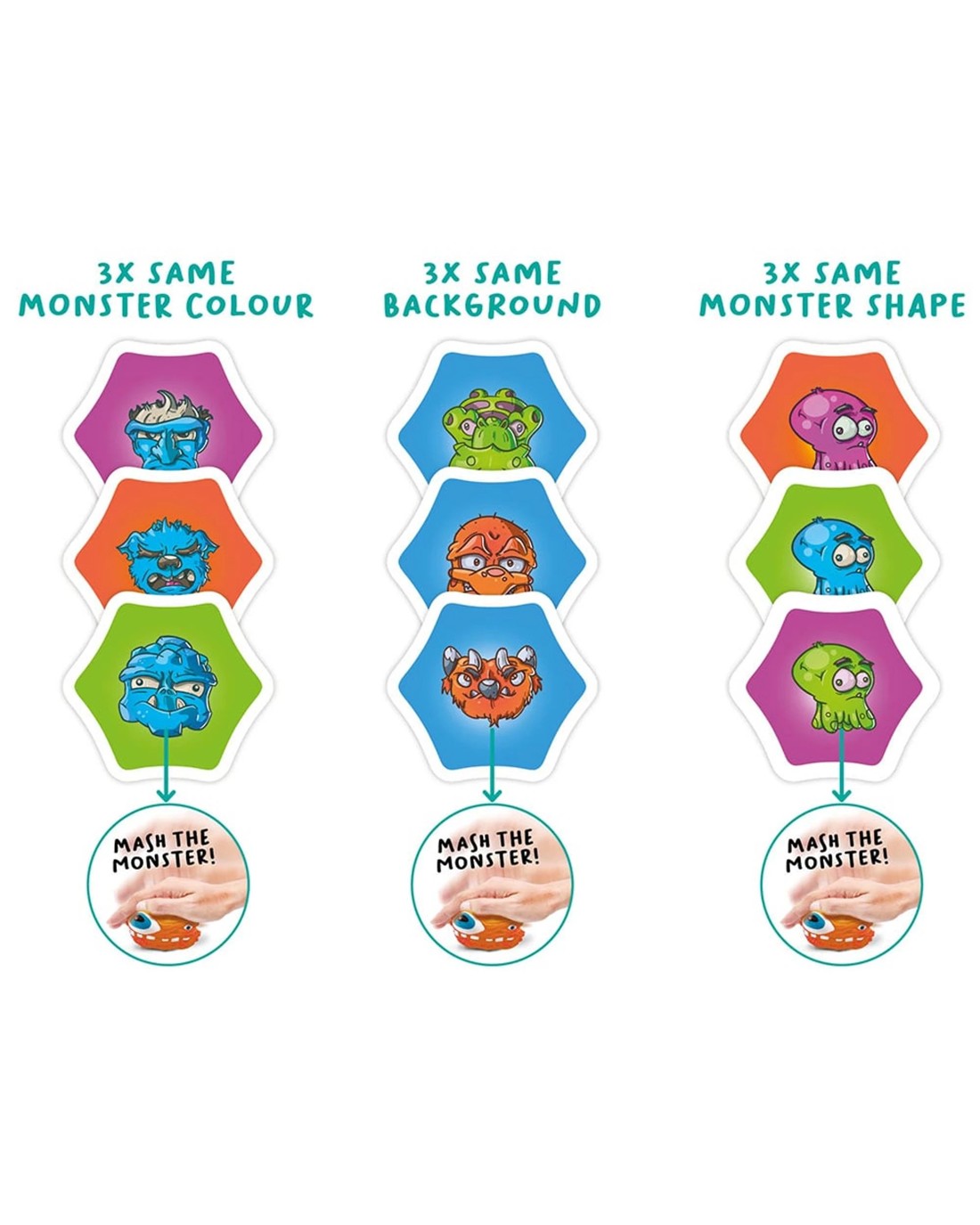 As Guardian of the Realm, your mission is to get rid of all the monster cards from your hand whilst your rivals try to do the same! Mash the monster and try to banish all the monsters to your opponents' land. But watch out for the multi-coloured monsters! Try to spot a correct combination of 3x the same monster, 3x the same monster colour or 3x the same background colour. Be the first to “mash” the flexible monster and banish the monsters to an opponent's land. Ages: 6 + | Players: 2 - 8