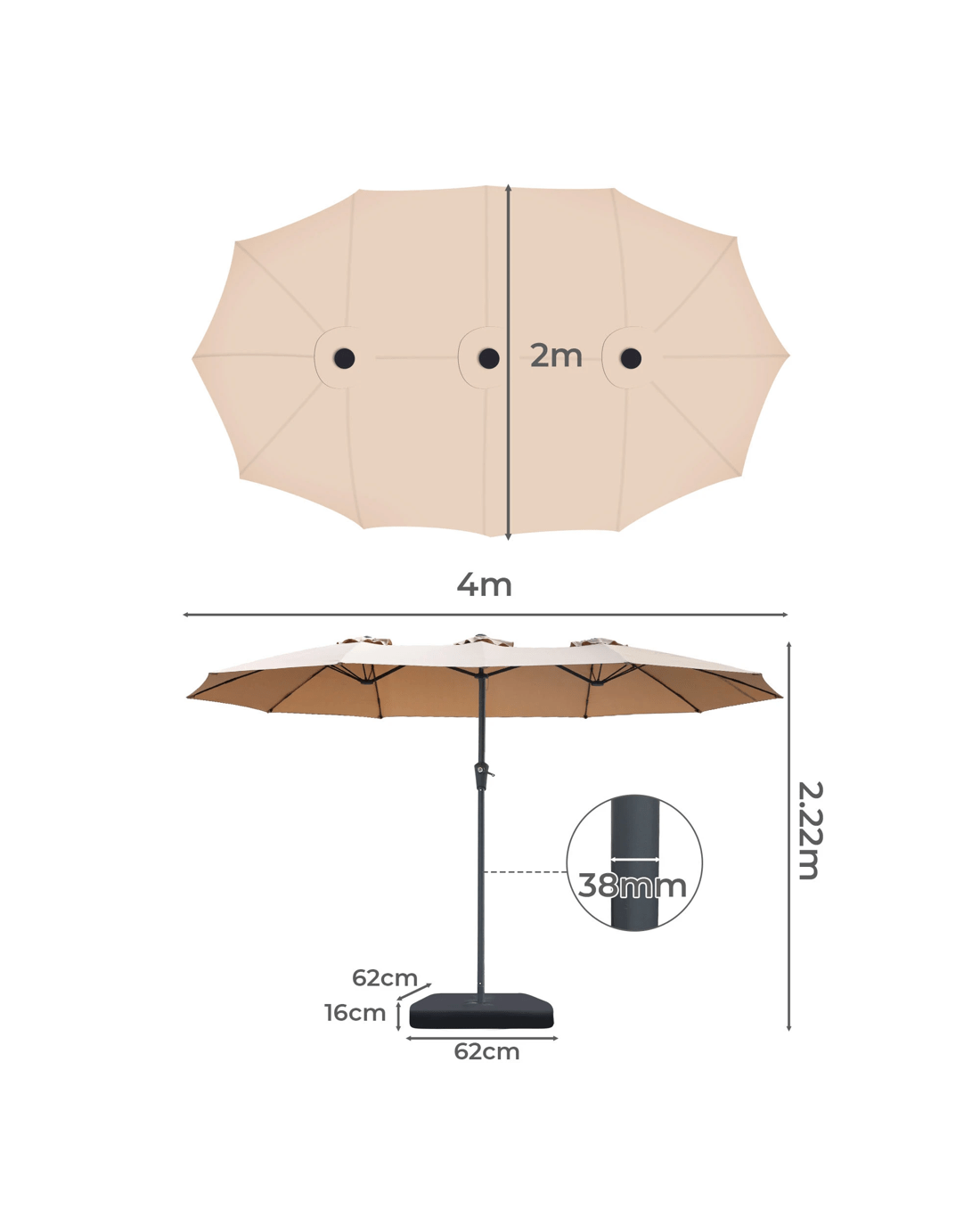 Umbrella: 400cm x 200cm x 222cm