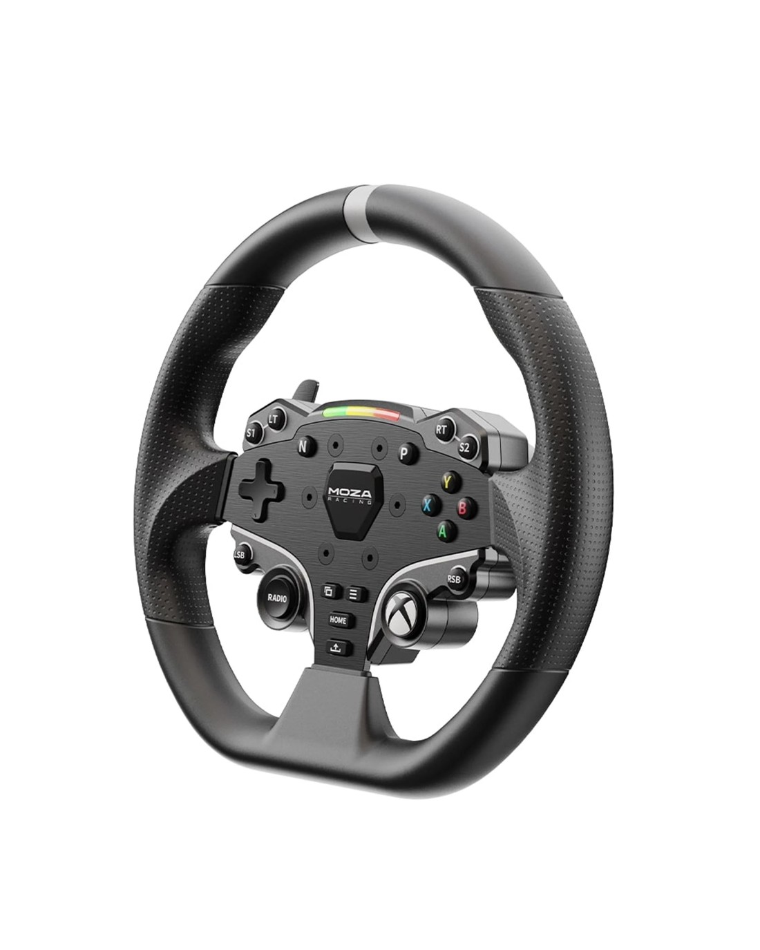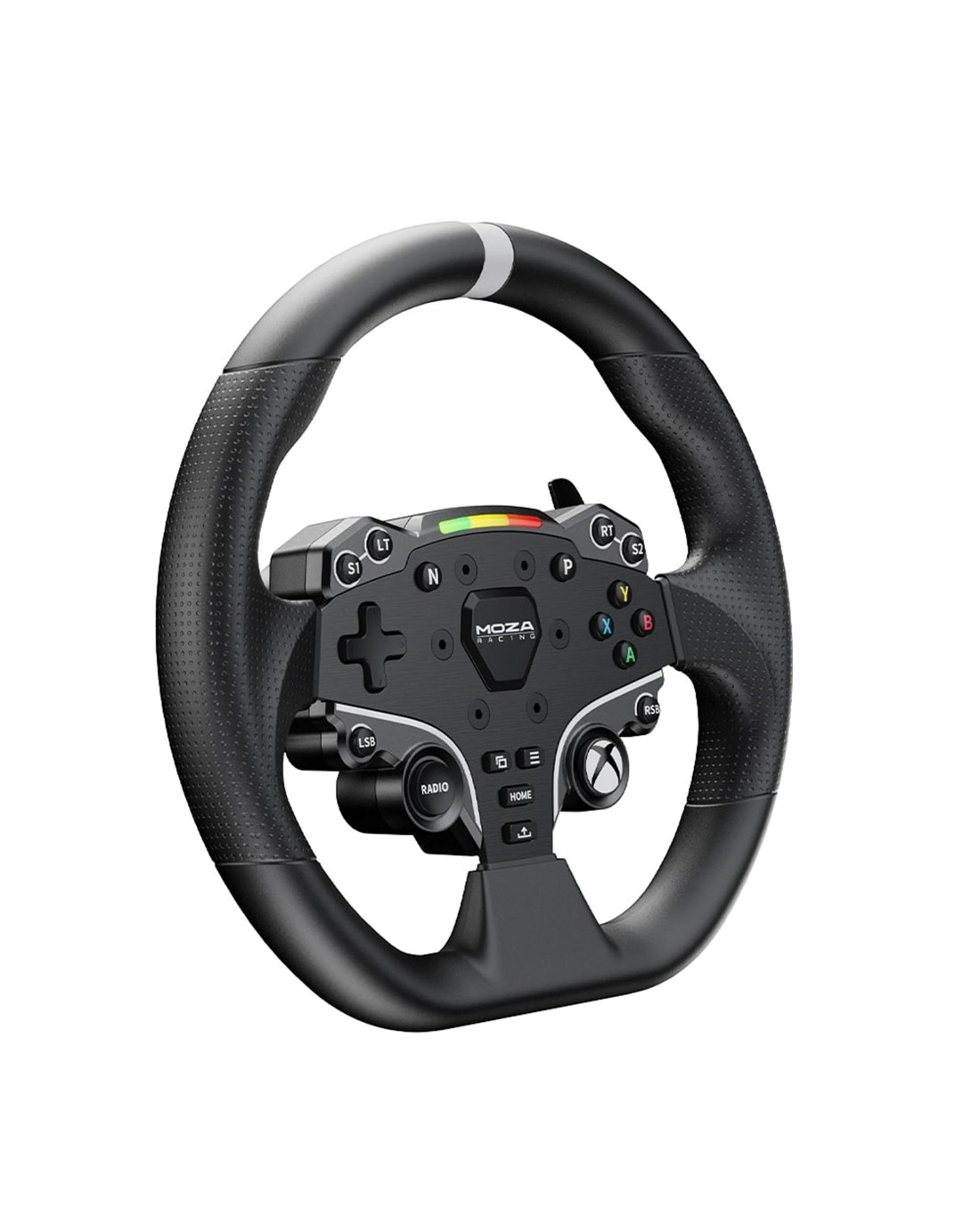 The MOZA ESX Steering Wheel for Xbox combines official Xbox licensing with MOZA Racing's direct drive technology to deliver an unparalleled racing experience. Designed with a solid aluminum alloy rim and non-slip, sweat-proof ISF PU grips, it ensures maximum durability and comfort during intense races. The wheel features 22 customizable buttons for complete control and on-the-fly adjustments, while the fully adjustable RPM LED lights add a dynamic touch to your setup. With the industry-leading MOZA quick-release system, swapping wheels is fast and effortless, making this the ideal choice for dedicated racers.