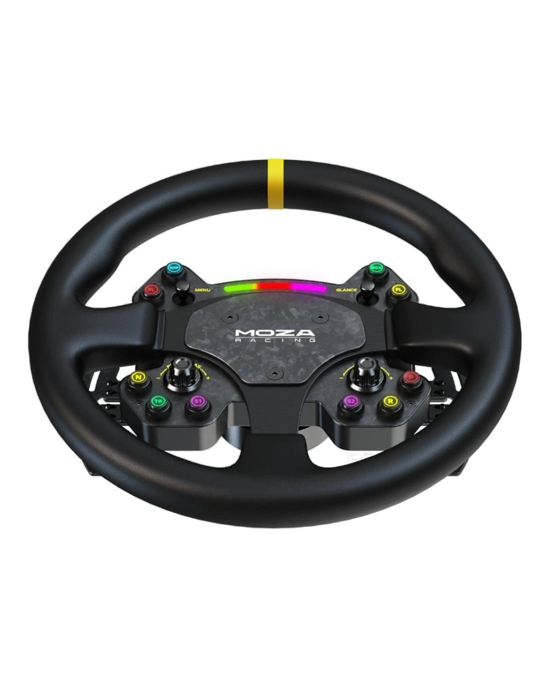 Dream racing at your fingertips Upgrade your sim racing setup with the RS sim racing steering wheel. This GT wheel offers compatibility with all MOZA wheelbases, seamlessly integrating for an optimized racing experience. Constructed using a combination of forged carbon fibre and aluminium, it ensures both resilience and elegance. Enjoy the 13-inch standard racing rim with an ergonomic design for utmost comfort during exhilarating races. Adorned with a genuine leather grip it provides a nice stylish touch. Effortlessly install and remove it with the built-in quick-release mechanism and choose between wireless or wired connections to match your preferences. The LED RGB Rev Light heightens your racing immersion while the carbon fibre magnetic shifters guarantee precise gear changes.