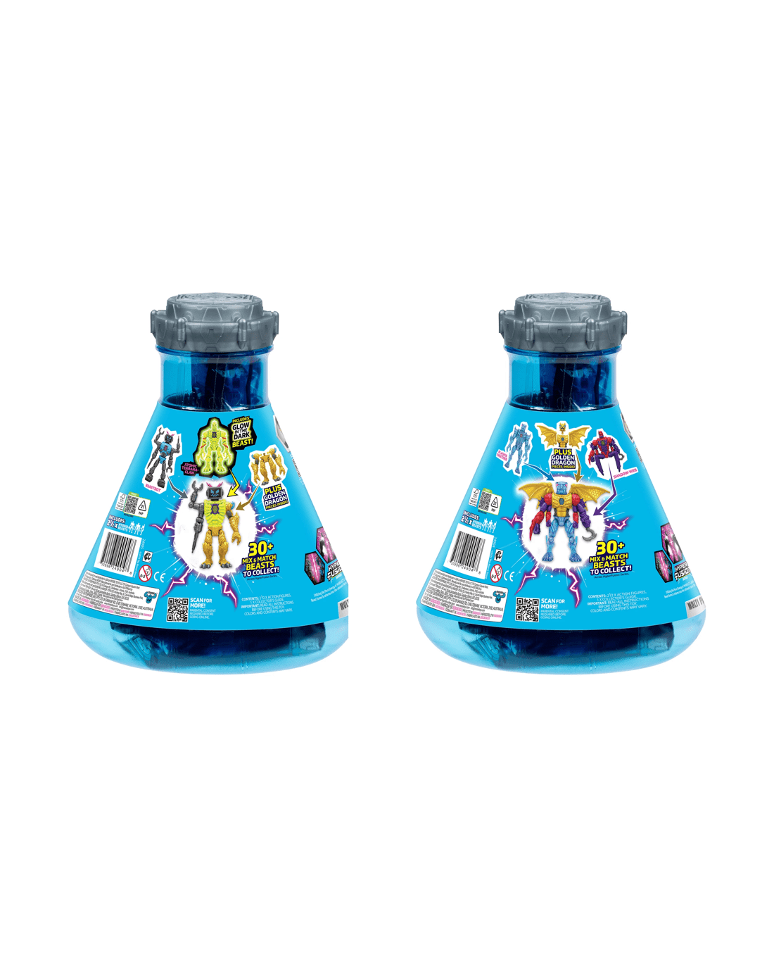 For the first time ever, kids can step into MrBeast’s Lab to create the ultimate beast! With MrBeast Lab Hybrids, the power of fusion lies in their hands - mixing and matching millions of combinations to build the ultimate MrBeast Action Figure! The first step begins with the MrBeast Lab vessel - twist and crack open the lid to reveal a strip of sealed foil bags. Rip them open to uncover individual beast parts, to create two epic action figures, plus parts of the Golden Panther Dragon. Collect both Multi Packs to complete this Ultra Rare Gold Dragon. Discover and combine two different MrBeast Hybrid characters in the Multi Pack to create the ultimate beast. With over 30 Beasts to collect, including Rare, Ultra Rare and Premium Edition, the race is on to build and create the ultimate collection! Standing at 4-inch (10.16cm) tall with 10 points of articulation, MrBeast Lab Hybrids are built for action and the perfect toy for kids! Each Multi Pack contains two complete Hybrid Beasts inside, plus parts of the Golden Panther Dragon that are waiting to be revealed. Fuse, customise and expand your MrBeast Lab Hyper Fusion collection - start creating today! And make sure to check out all the all-new MrBeast Lab animated content releasing on YouTube and watch the Hybrids in action!