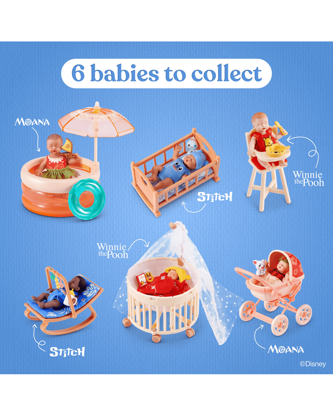 • Collect them all: Discover 6 surprise babies to collect, each with unique accessories and playsets inspired by Disney favourites like Moana, Stitch and Winnie the Pooh