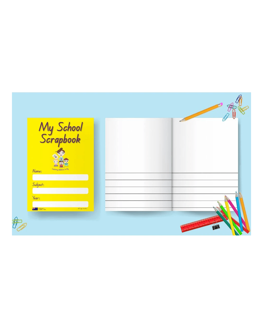 Spark curiosity and promote early literacy skills with this My School Scrapbook. Designed specially for the Prep curriculum, this half page scrapbook allows students to complete a half page of writing on Prep writing lines, as well as a full blank page for a worksheet or illustration. Proudly printed in Australia, this 84 page yellow scrapbook is popular for at-home use.