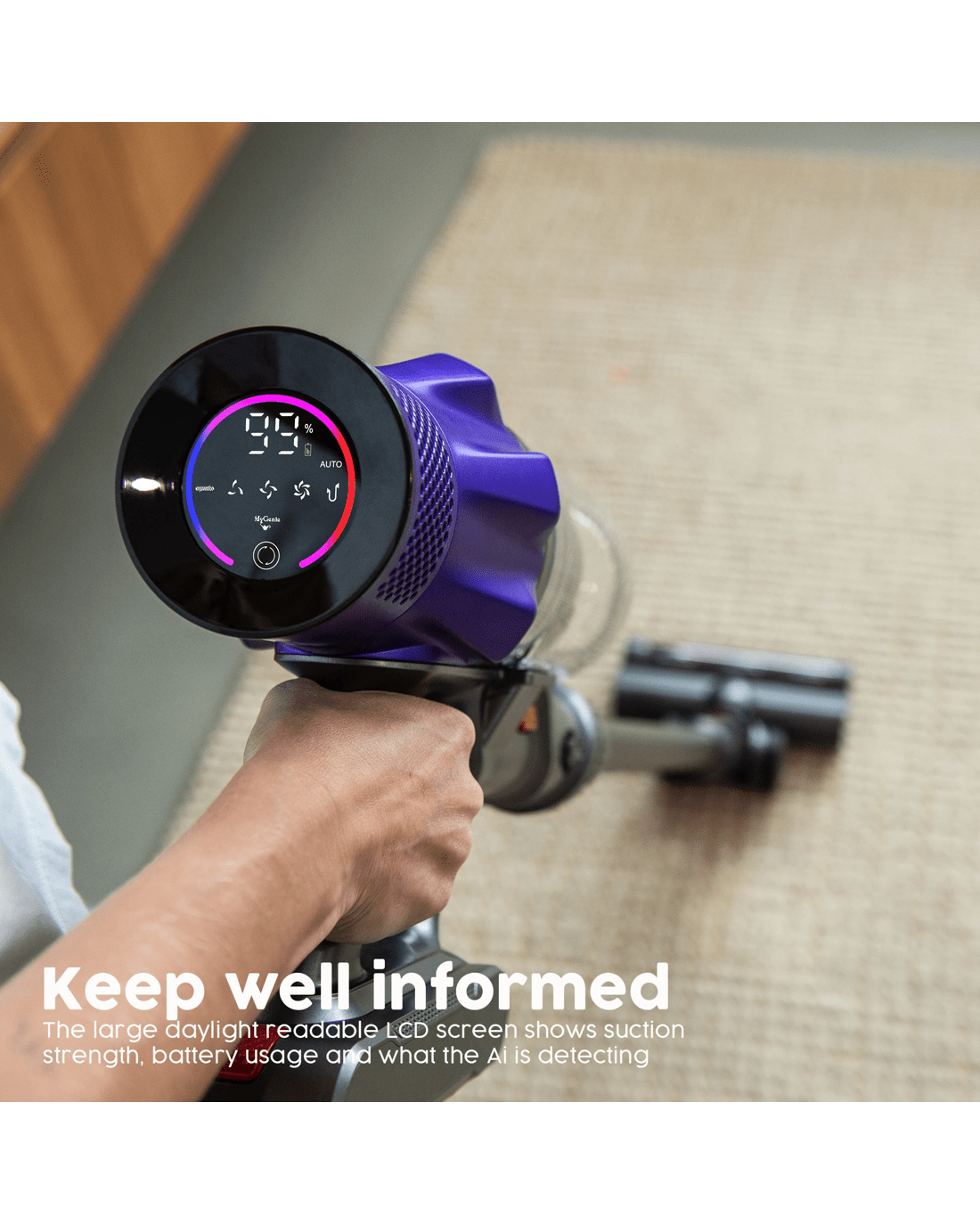 The MyGenie Sentinel Ai Pro is the intelligent way to clean your home. Powered by a 400W brushless motor with up to 33kPa suction, it tackles deep-set dirt, pet hair, and debris with ease. Switch between Eco, Medium, or Max modes — or let the Smart AI Dirt-Sensing Technology automatically adjust suction in real-time for maximum efficiency and battery life.