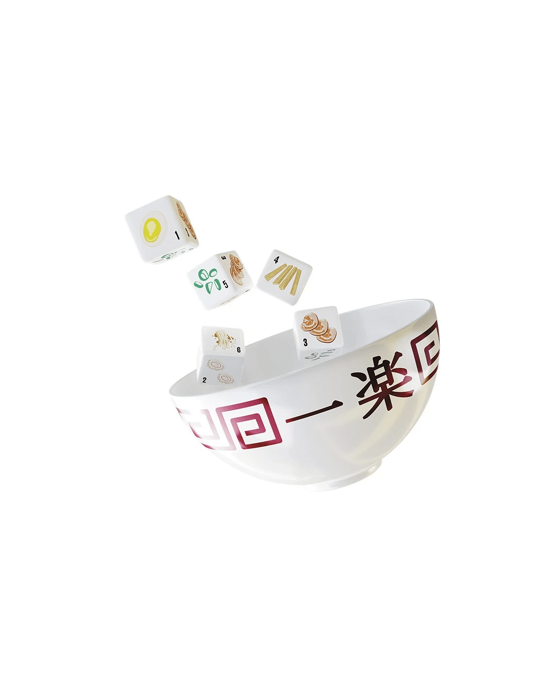 5 custom Yahtzee dice featuring ingredients - #1 Egg, #2 Fish Cakes, #3 Chashu, #4 Bamboo, #5 Green Onion, #6 Noodles