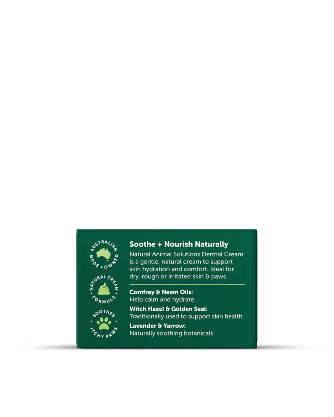 Dermal Cream is a gentle, non-greasy formula made with 10 natural ingredients designed to soothe, protect, and improve your pet’s skin. It provides cooling relief and helps restore moisture to dry or rough areas such as the nose, paw pads, elbows, and other irritated skin patches.