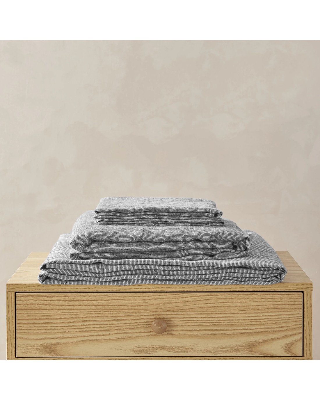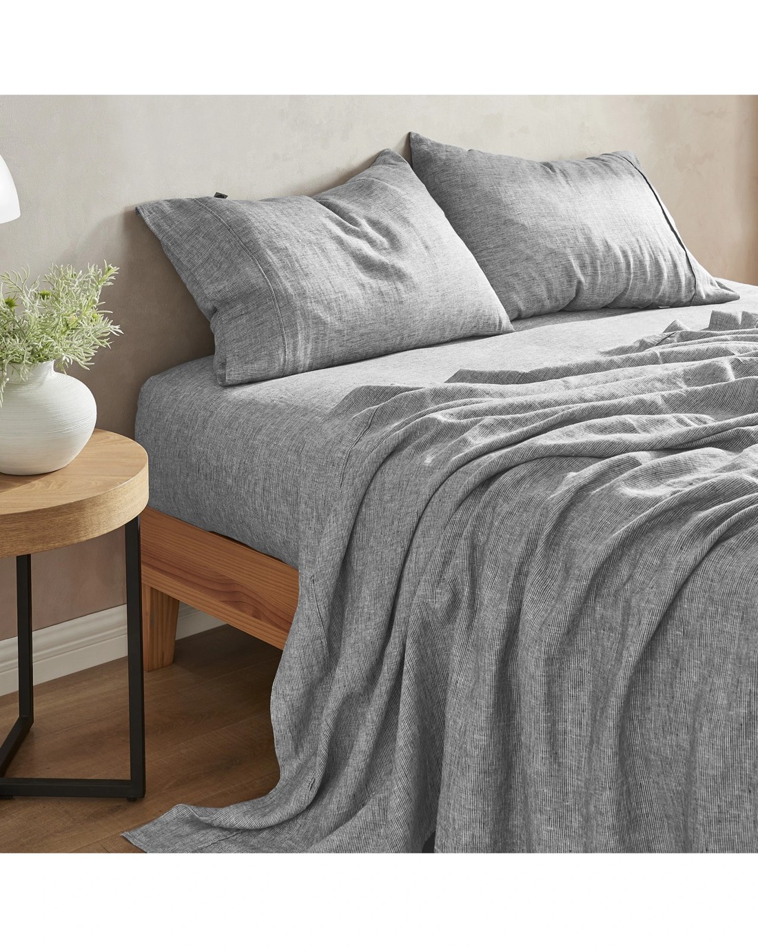 Featuring a deep fitted sheet that's up to 40cm deep, the Pinstripe Linen Sheet Set is the perfect fit for your mattress and for your quality sleep.