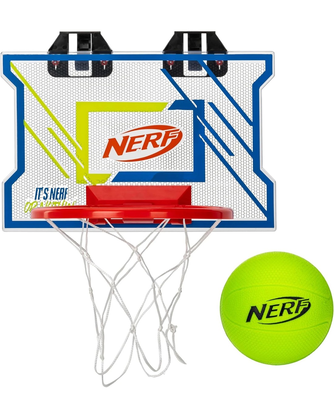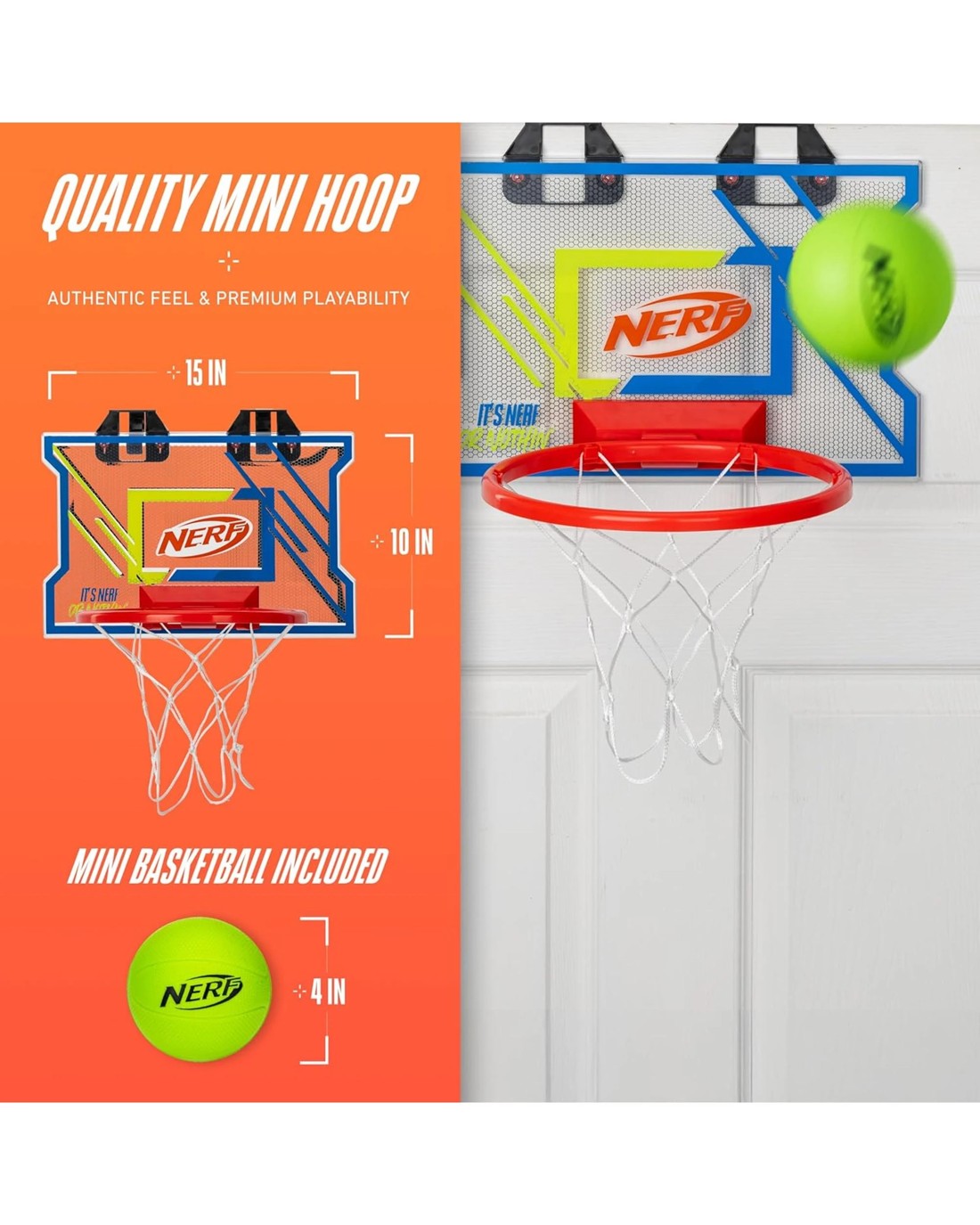 QUALITY MINI HOOP: Built with a 15 x 10 clear plastic backboard and rim for an authentic feel and premium playability!GREAT FOR DUNKING: The quality components of this hoop make it strong enough to stand up to the most powerful dunks without bending or breaking!MINI BASKETBALL INCLUDED: This set comes with a 4" inch NERF mini foam basketball so you'll have everything you need to play right out of the box!FITS ANY STANDARD SIZE DOOR: This over-the-door mini hoop is designed to fit on any standard sized door for quick and easy assembly wherever you want to play!BRING THE GAME HOME: This set turns any bedroom or living room into center court in no time to help you bring premium basketball action right into your home!Contents